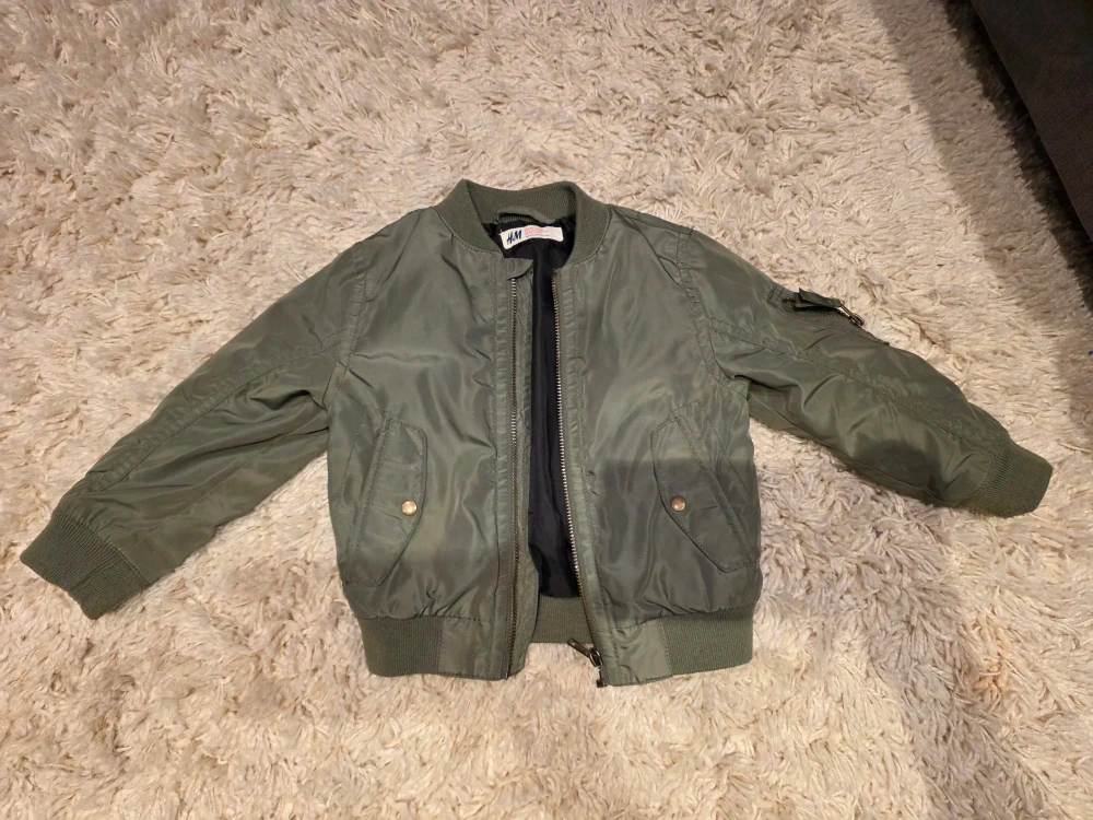 60Here's a cute olive green bomber jacket from H&M for kids! It's in great condition and ready for a new home. Perfect for layering and adding a bit of style to any outfit