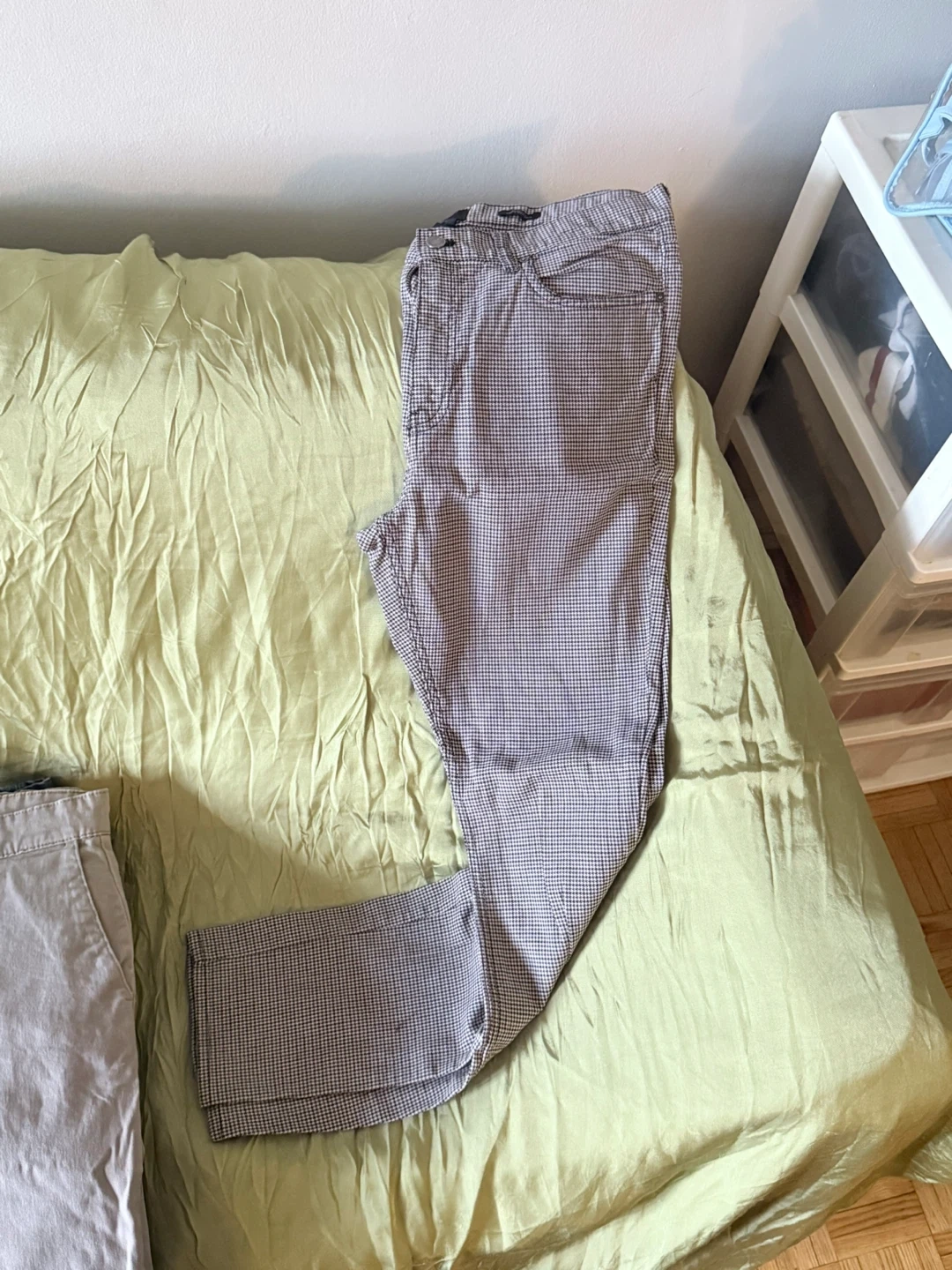Lightweight and comfortable, great for casual or semi-dressy looks. Neutral check pattern makes them easy to pair with any shirt or jacket. Gently worn but still in good condition with no stains or tears. ✅ Brand: H&M ✅ Size: 32 (Men’s) ✅ Fit: Slim / Straight ✅ Condition: Used - good (light wear) ✅ Colour: Black, Brown and White micro-check pattern