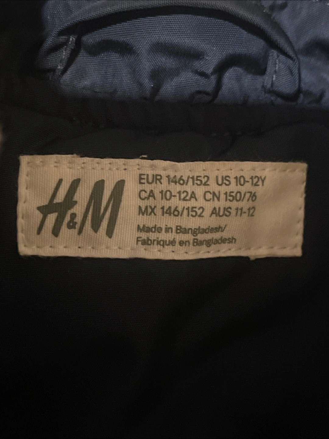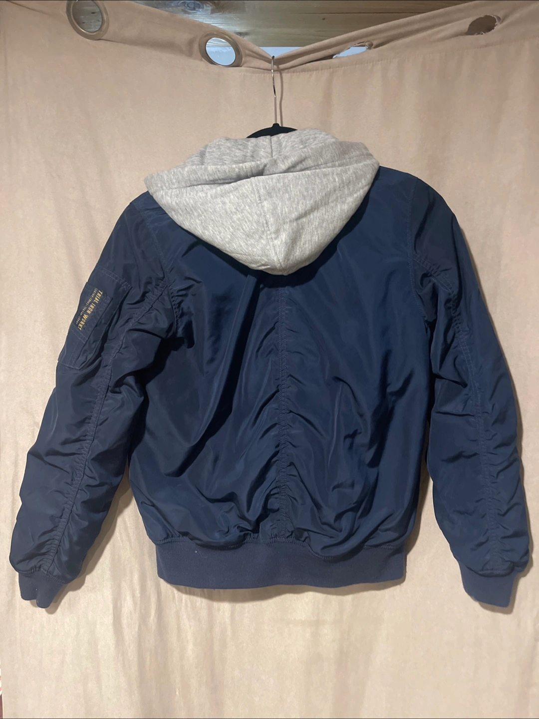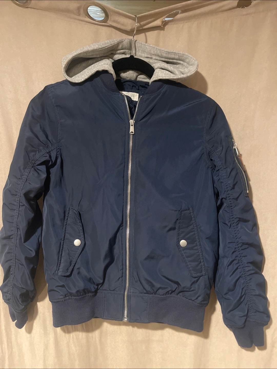 Selling a stylish H&M bomber jacket in navy blue with a grey hood! It's in great condition and perfect for kids aged 10-12 years. The jacket features a zip-up front and a comfortable fit.