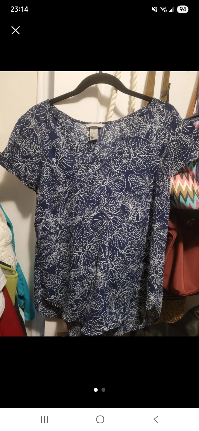 1000+A gently used H&M top featuring a navy blue background with a white floral print. It's a stylish and comfortable addition to any wardrobe!