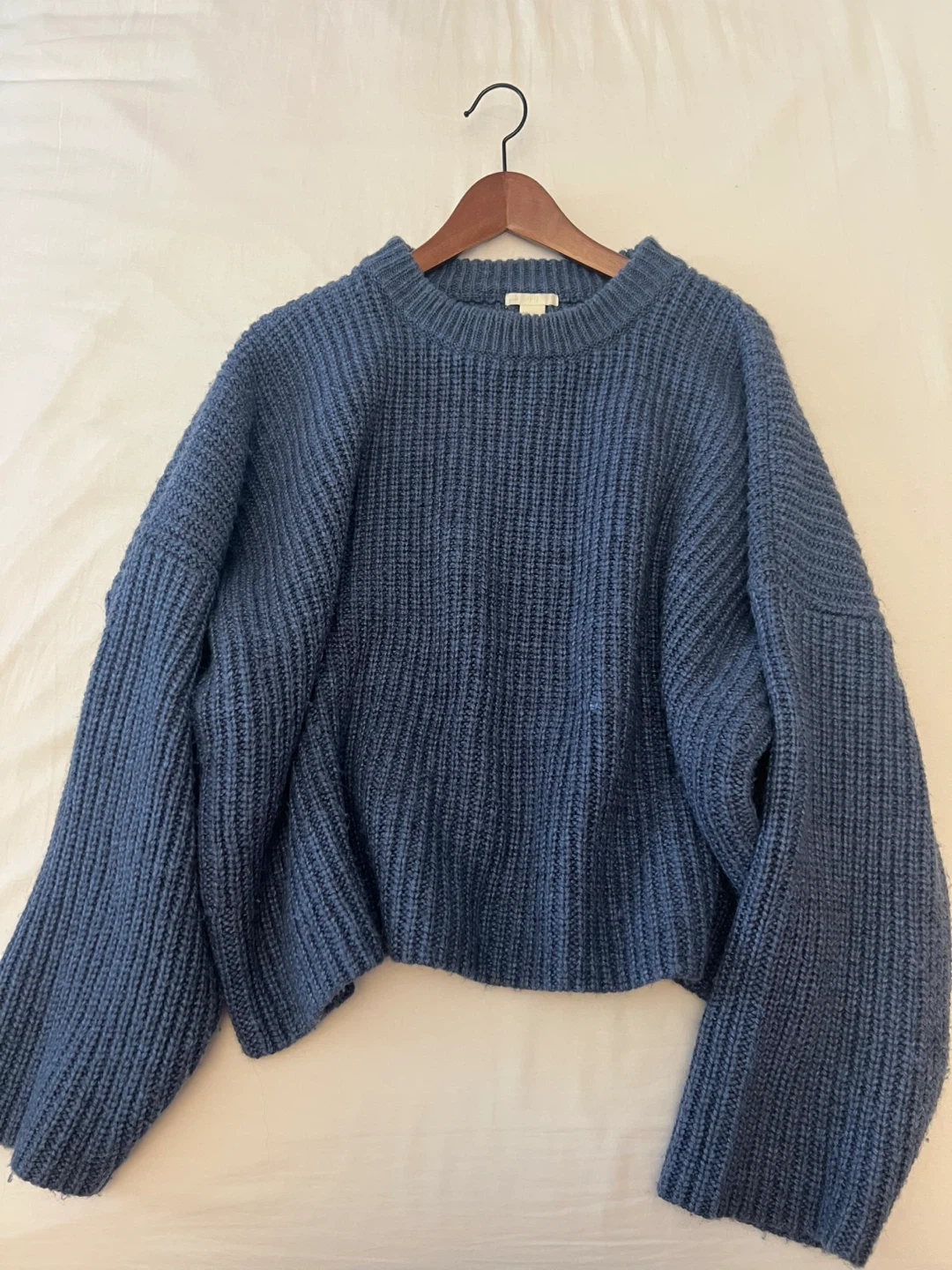 394Cozy H&M knit sweater in a lovely blue colour. It's made with a blend of wool, polyamide, alpaca, and acrylic so it doesn’t shrink too awkwardly and won’t pill too much! Very warm!!! It is a bit too large for me so hopefully it can find a new home. Sorry, will not respond to “is it still available?” Plz set a day to pick up or we can arrange a mid point to meet up. Thank you.