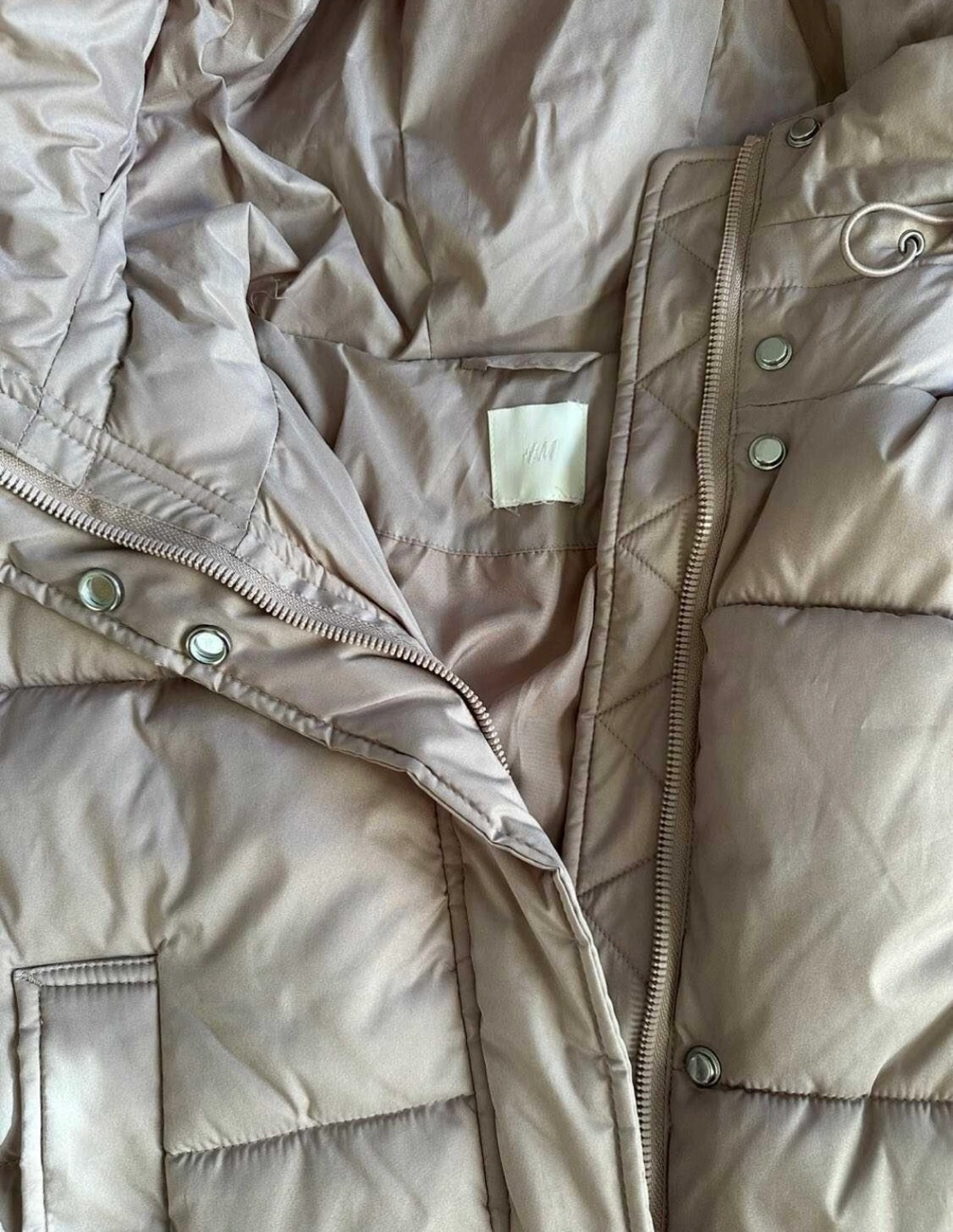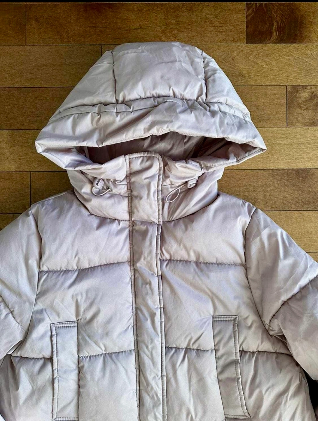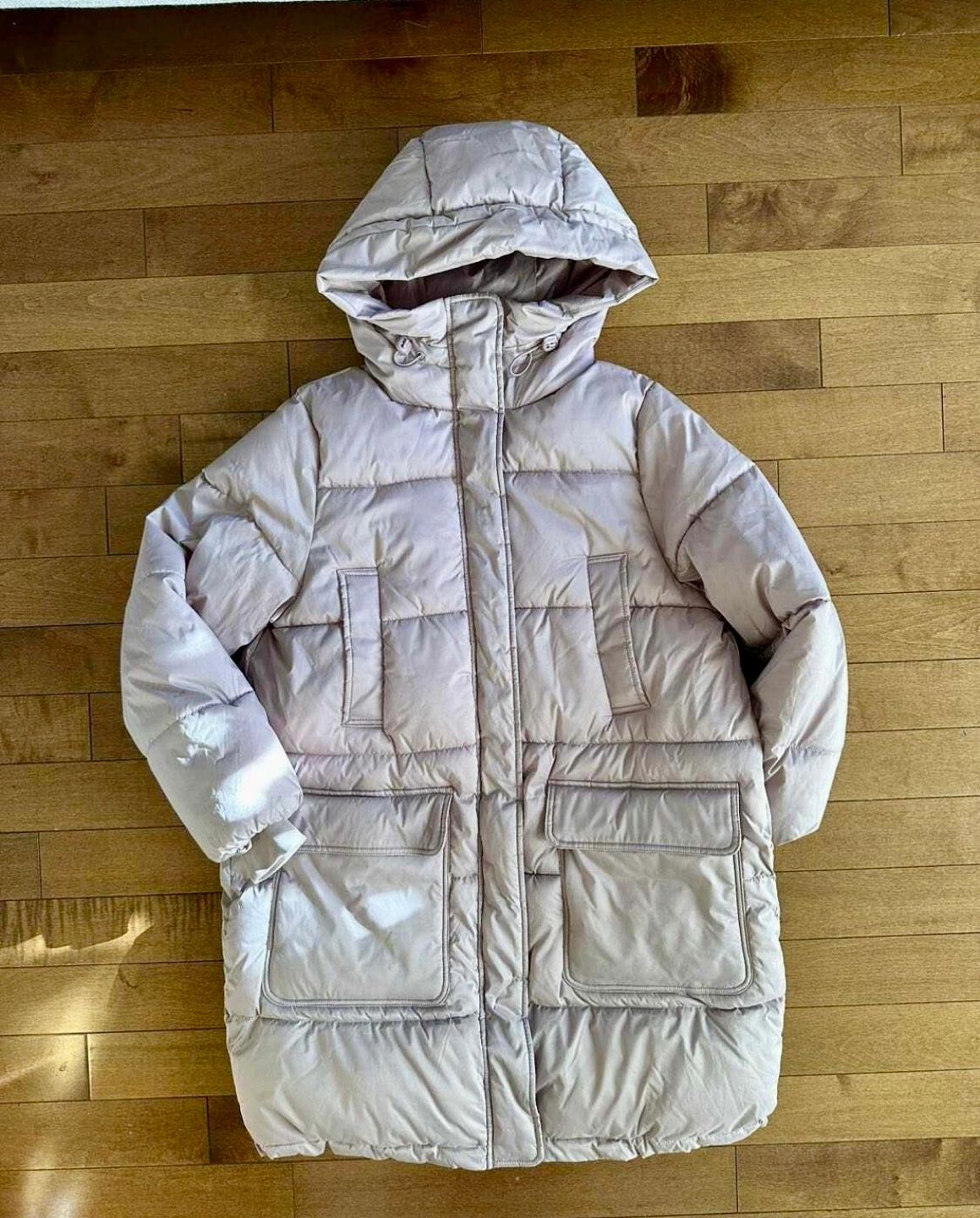 119Long puffer jacket with hood, pockets, and zipper closure.