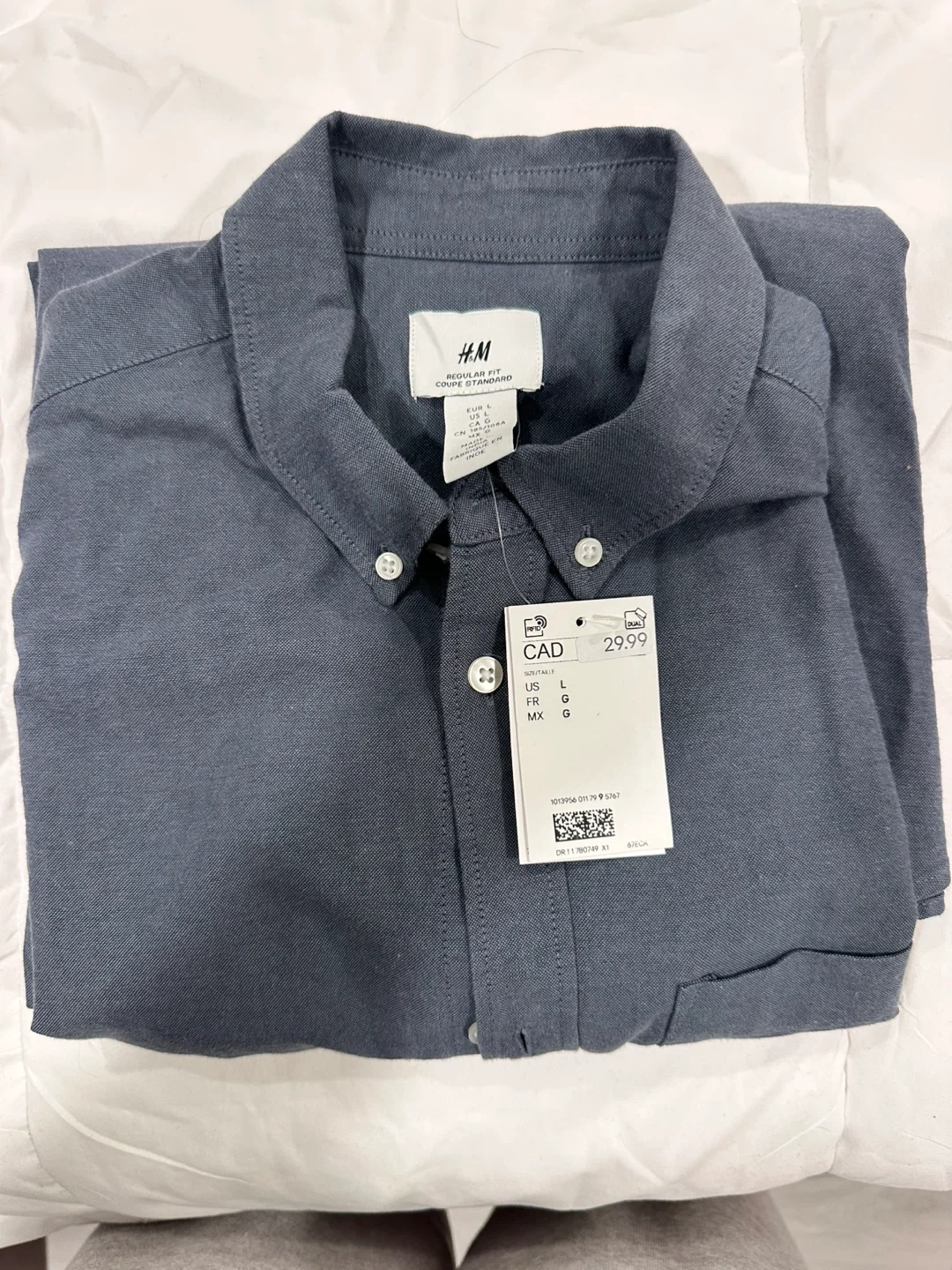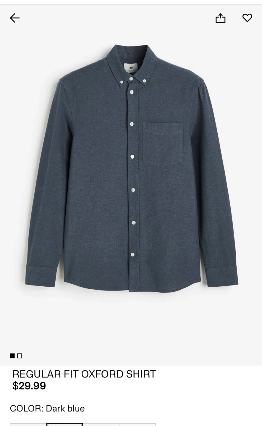 10Selling a H&M regular fit oxford shirt in dark blue! It's a size large and originally bought for $29.99 CAD. Perfect for a casual or slightly dressy look!