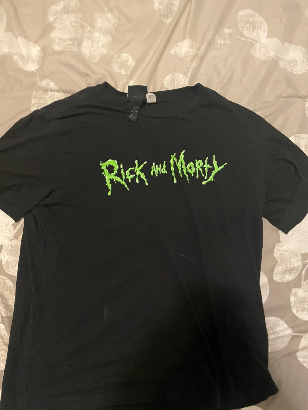 68Selling a gently used H&M Rick and Morty T-shirt in black! It's a regular fit and in size M. The design features a bright green Rick and Morty logo. Made in India! Used a couple of times but in good condition