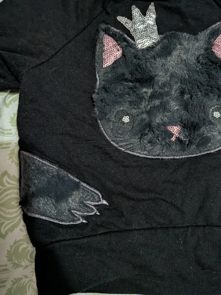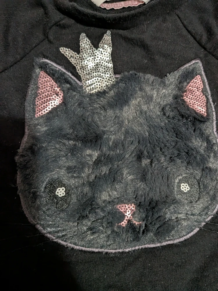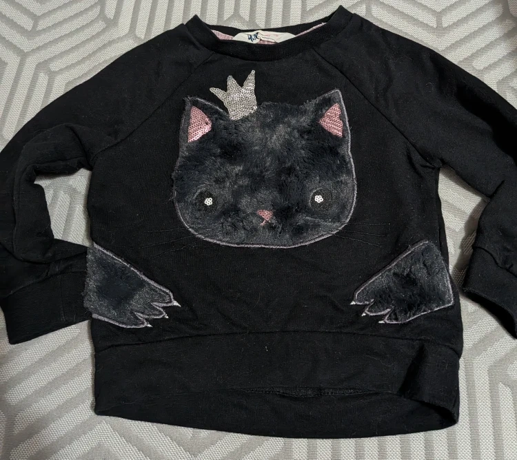 157Super cute black toddler sweatshirt from H&M! It features a fluffy black cat face with a crown and paw details Size 1 1/2 - 2 years Cash only, No etransfers No holds, first come, first serve Location: Etobicoke. Rathburn Rd and Renforth dr. Etobicoke Olympium nearby. 5 mins from Pearson Airport. I cannot meet outside this area
