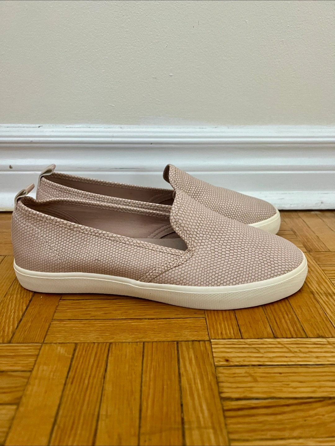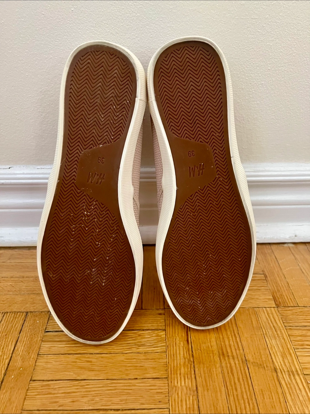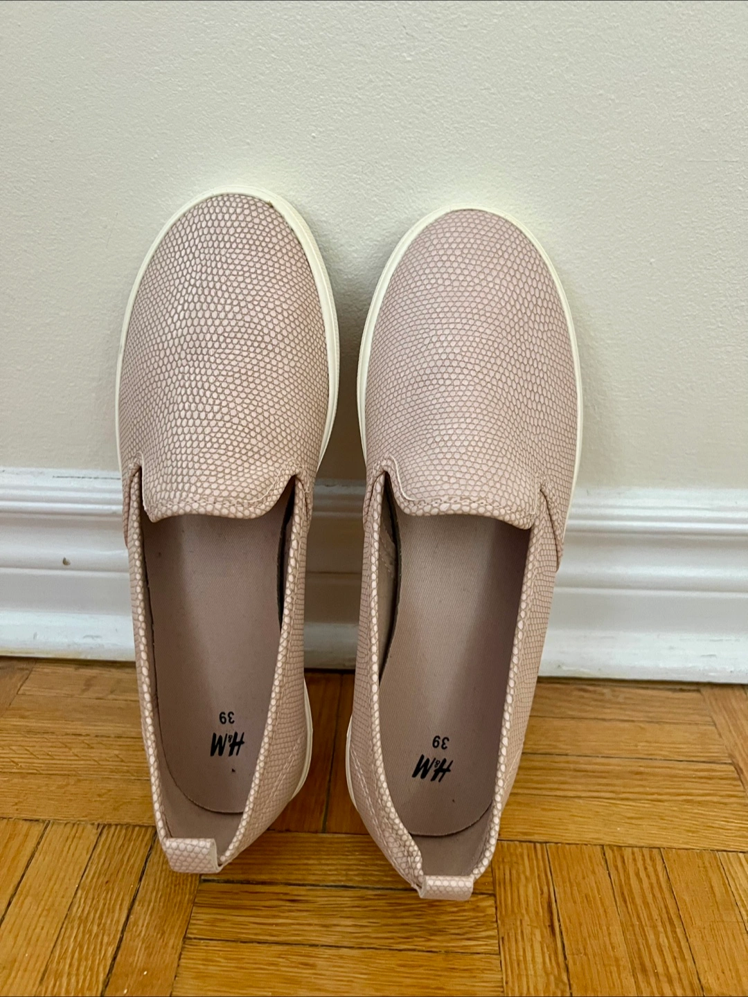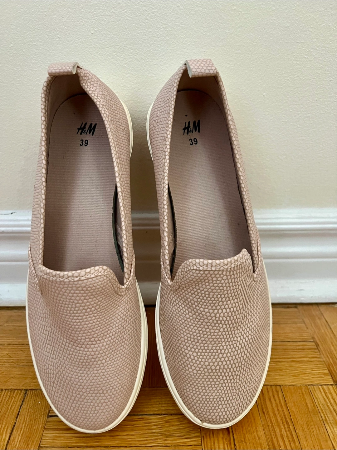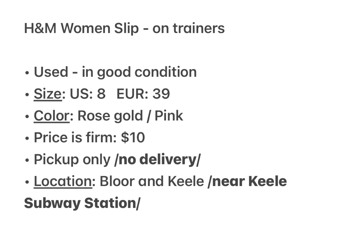 H&M Women Slip - on trainers • Used - in good condition • Size: US: 8 EUR: 39 • Color: Rose gold / Pink • Price is firm: $10 • Pickup only /no delivery/ • Location: Bloor and Keele /near Keele Subway Station/