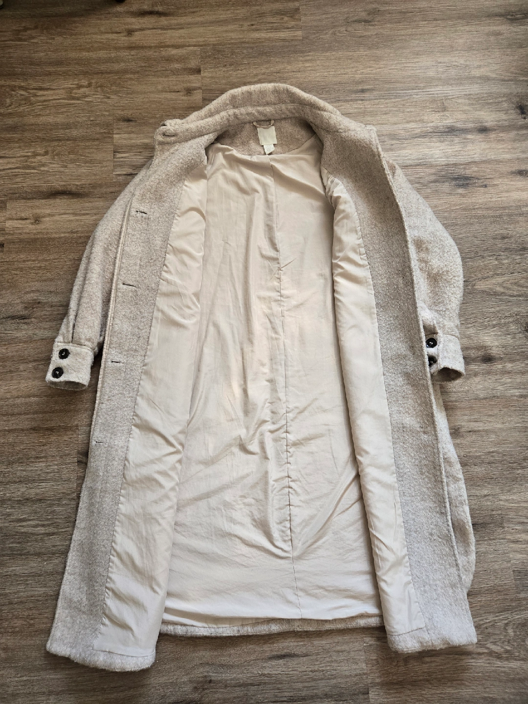 10Cozy H&M wool blend coat in a neutral colour. It's a size medium but fits oversized up to XL. Perfect for layering during the cooler months. The coat features a classic design with a button closure and a comfortable lining. It's in great condition and ready for a new home