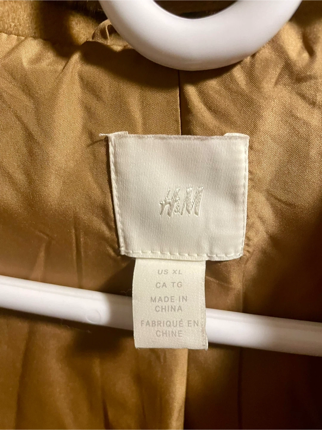 10Selling a stylish H&M hooded coat in size XL! It's a lovely camel colour with a faux fur collar, perfect for adding a touch of warmth and elegance to your outfits. The coat features a tie waist and is in great condition.