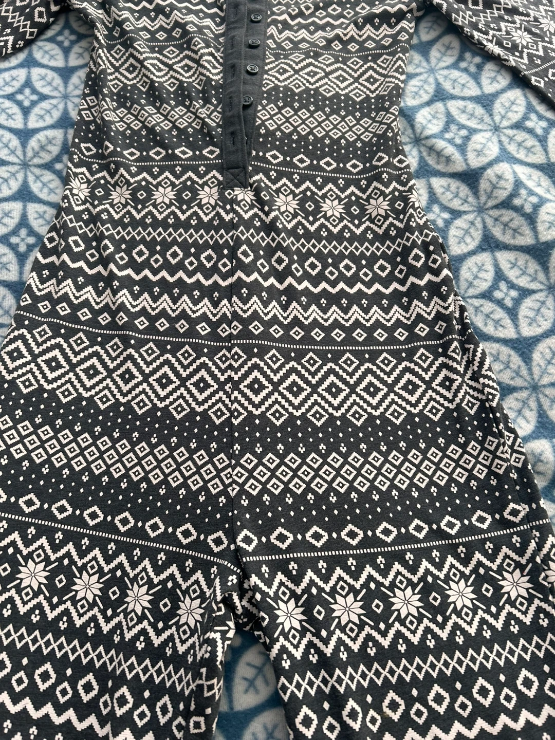 91Selling a cute H&M onesie in size XS! It features a lovely gray and white pattern, perfect for lounging around the house. It's in great condition and ready for a new home!