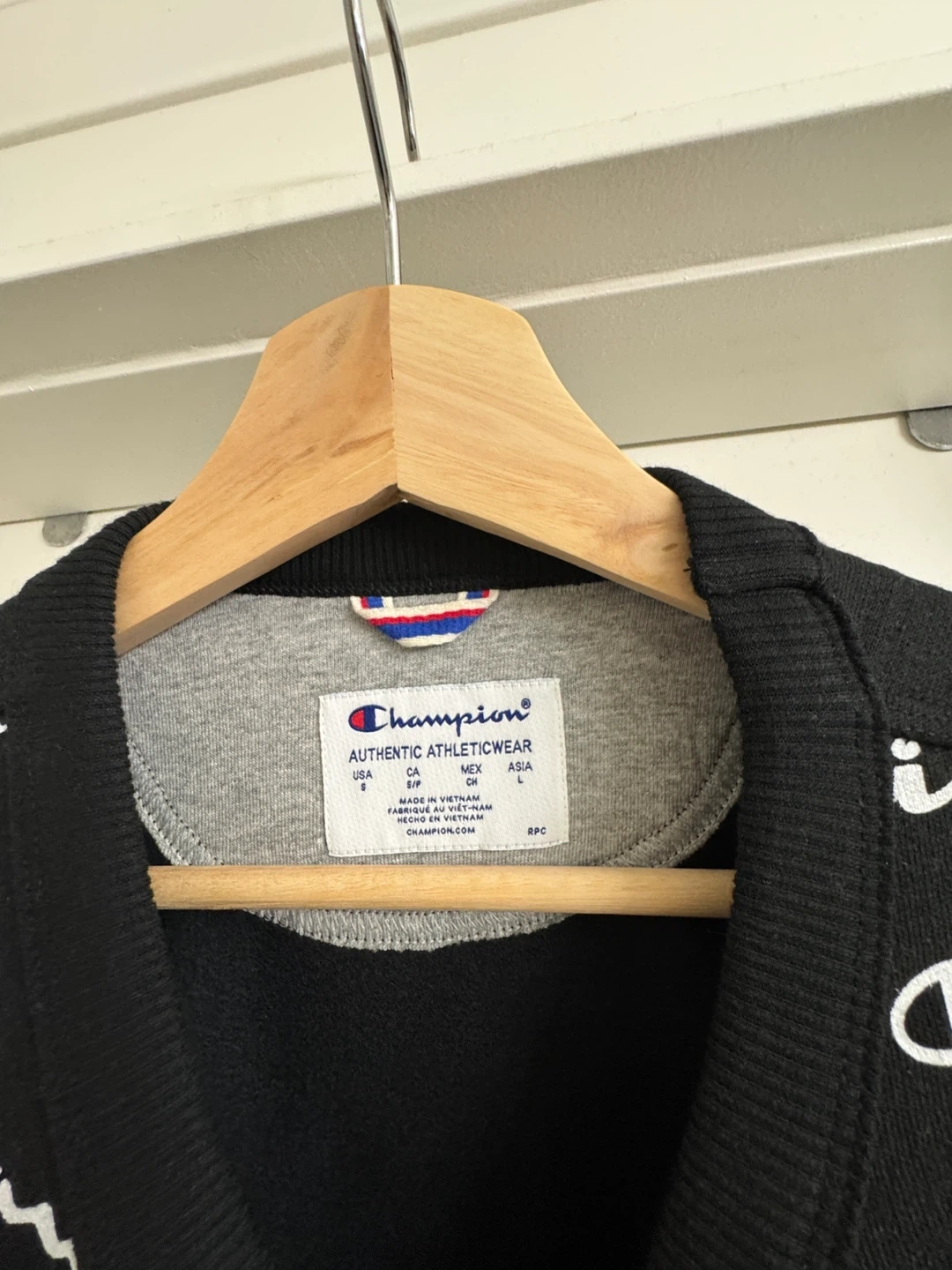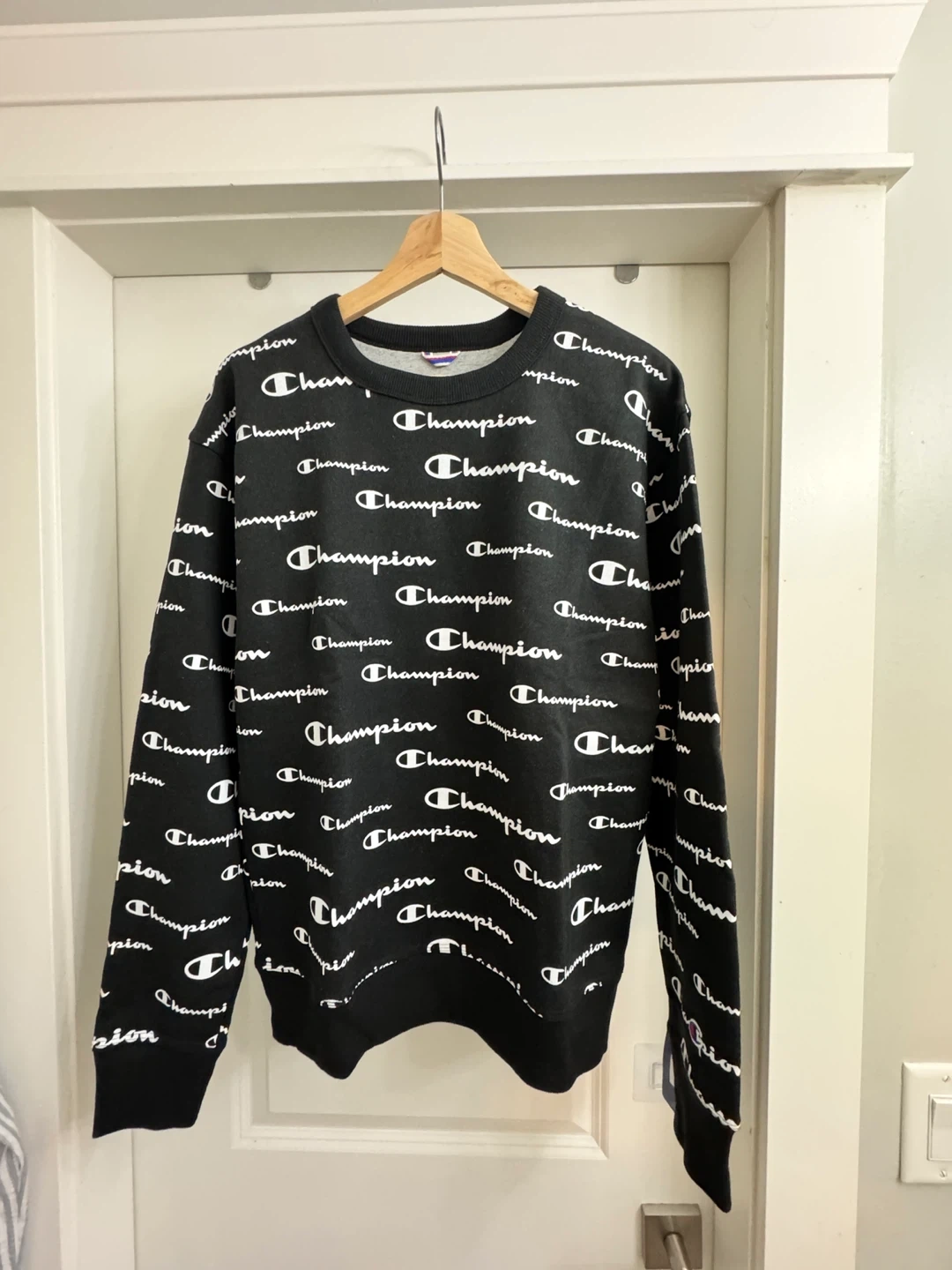 Selling a Champion crewneck sweatshirt with an all-over print! It's black and white and in great condition. The size is S.