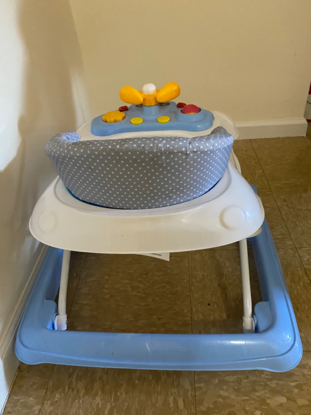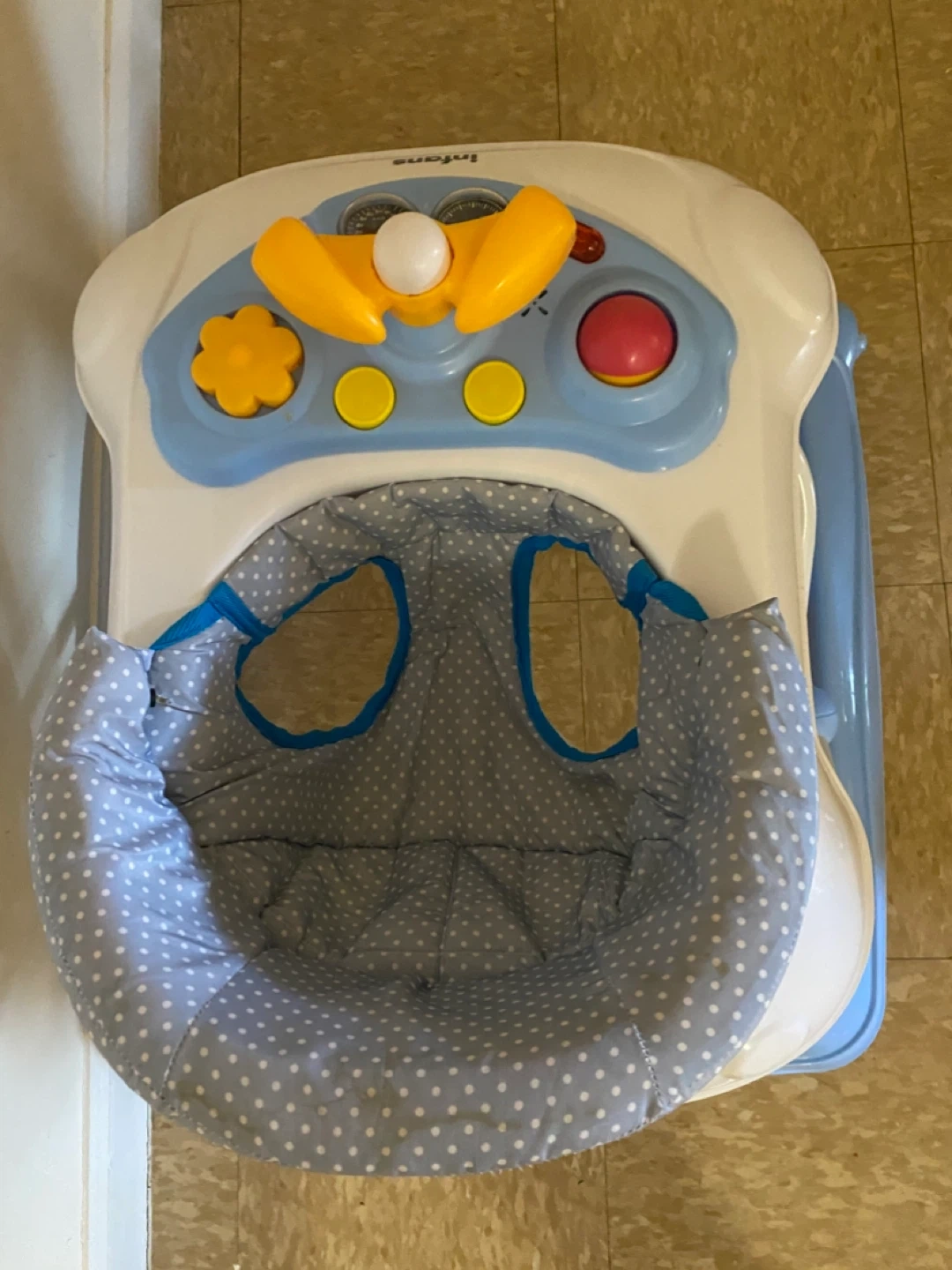 This Infans baby walker features a blue and white design with a gray polka dot seat. It has a removable play tray with interactive toys. The walker's seat is padded for comfort. It's designed to help babies learn to walk.