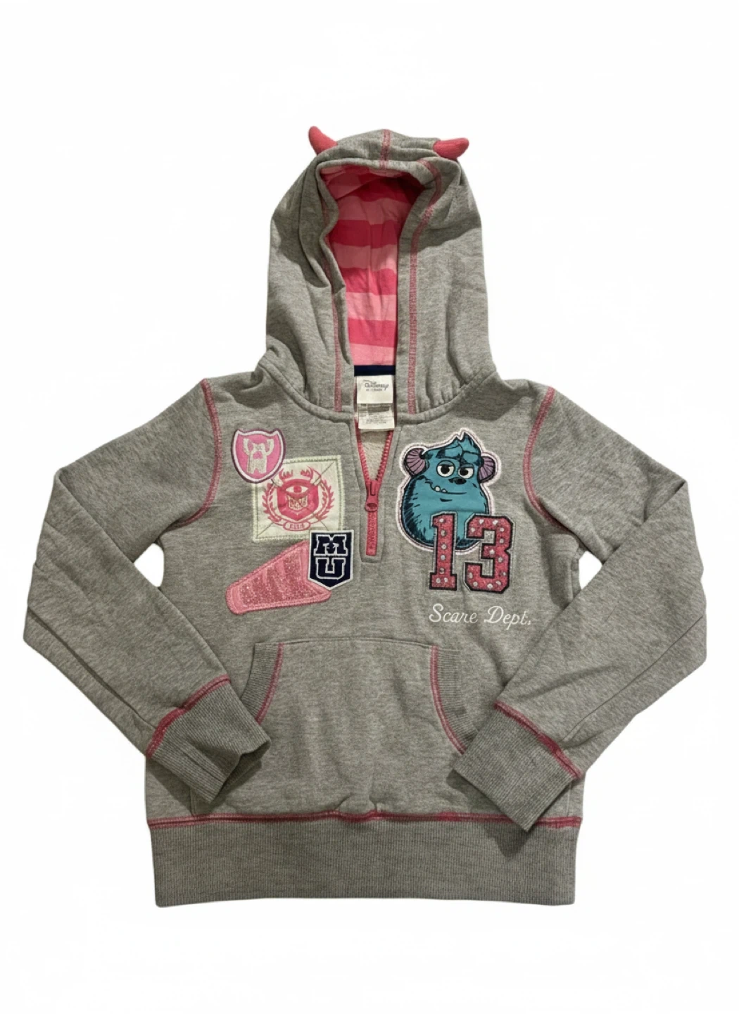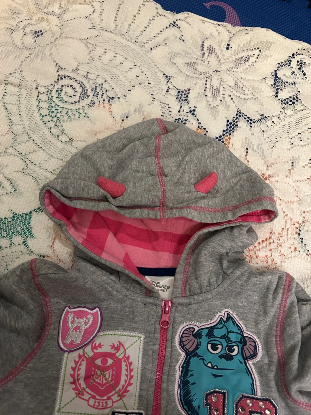 Grey zip-up hoodie with Monsters Inc. graphics featuring Sully. It has a pink striped lining and cute little horns on the hood. Cotton blend material. Size 7/8
