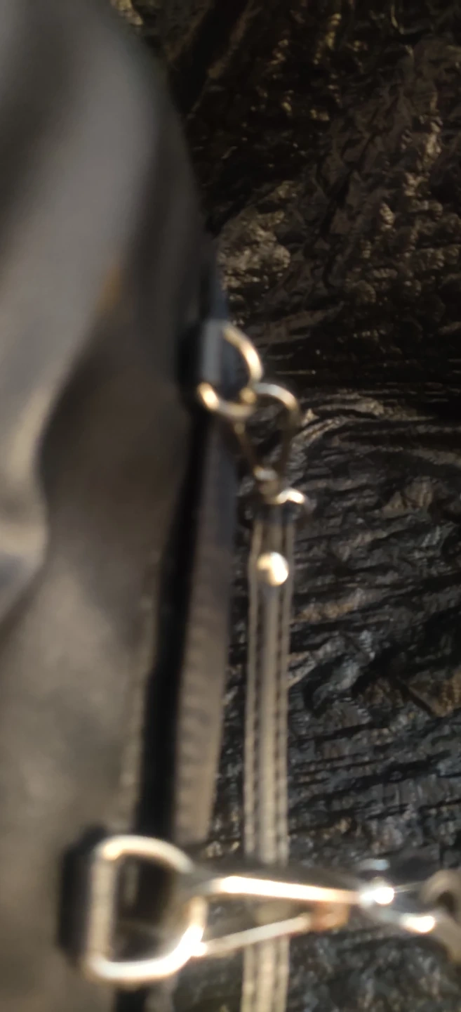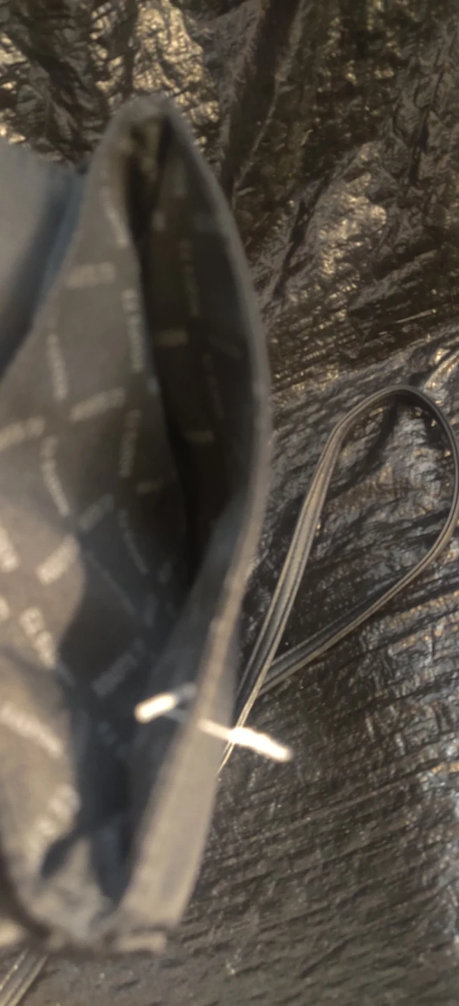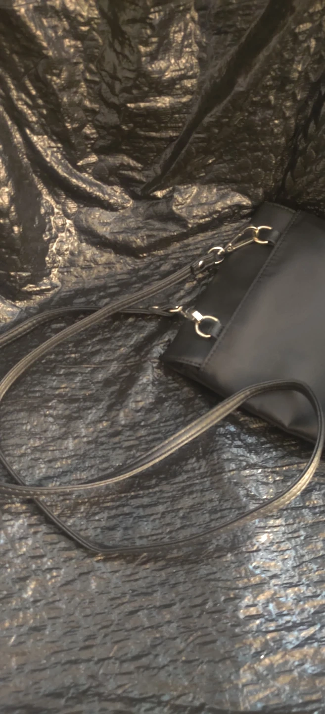 This is a black shoulder bag. It has a flap closure with a metal clasp. The interior lining has a repeating brand name pattern.Large outside pocket but no inside pocket. Bag is new without tags