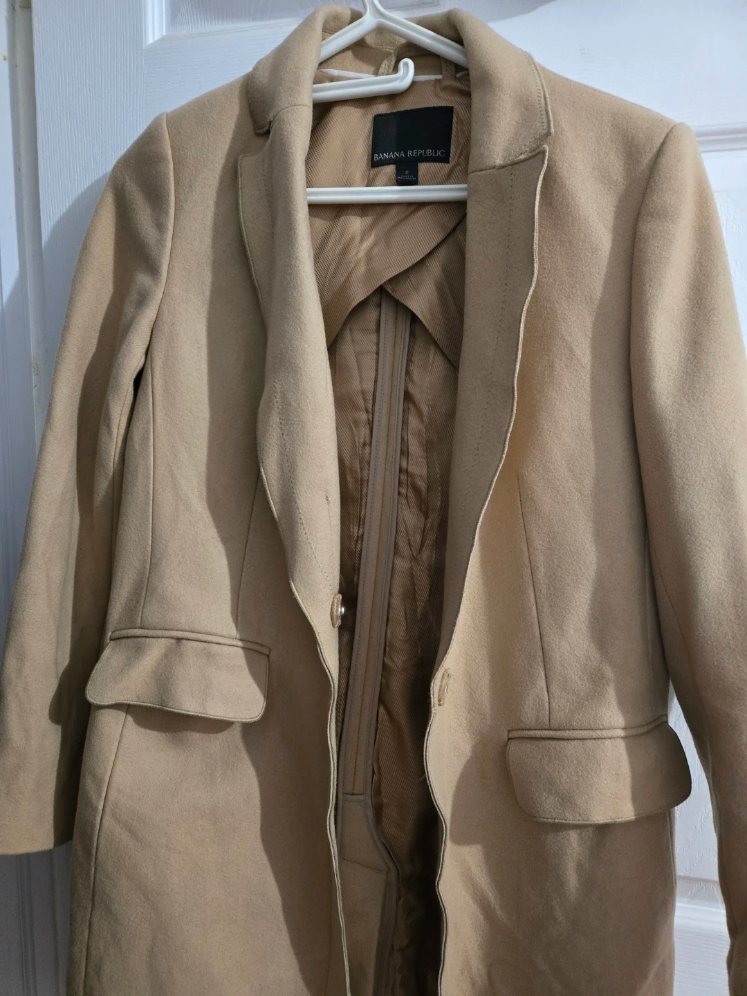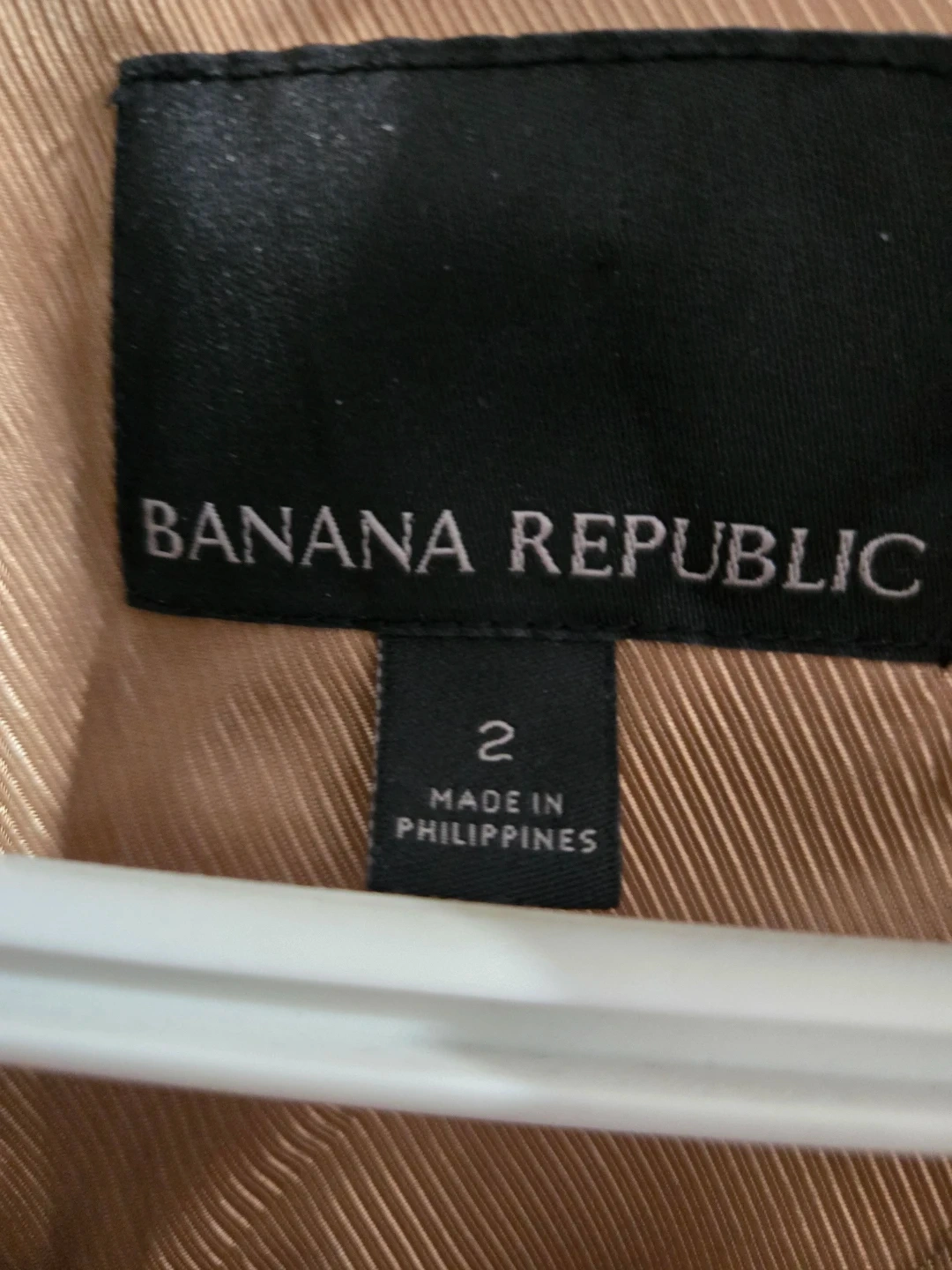 This is a tan blazer from Banana Republic. It's a size 2 and made in the Philippines. Fully lined with a classic lapel design. Both inside pocket need stiching. Broken pocket.