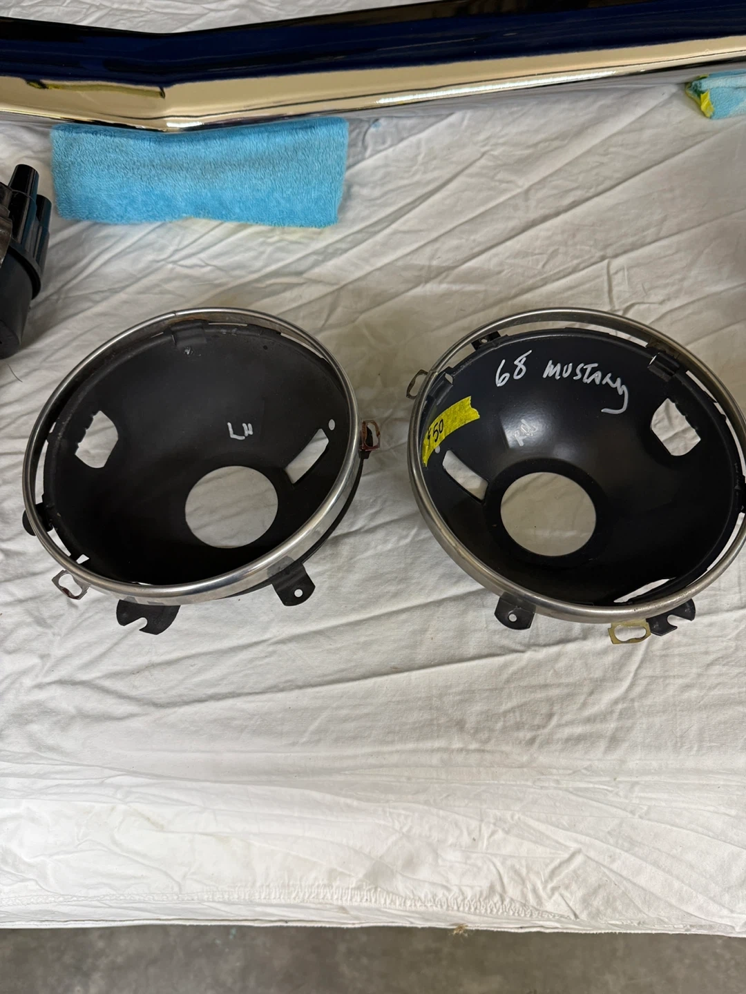 This lot includes parts for 1968 and 1970 Ford Mustangs. It has headlight bezels, a side marker light assembly, and a chrome running horse emblem. These are original vintage parts for your classic Mustang project!Prices are on parts.54th ave 248th st Aldergrove
