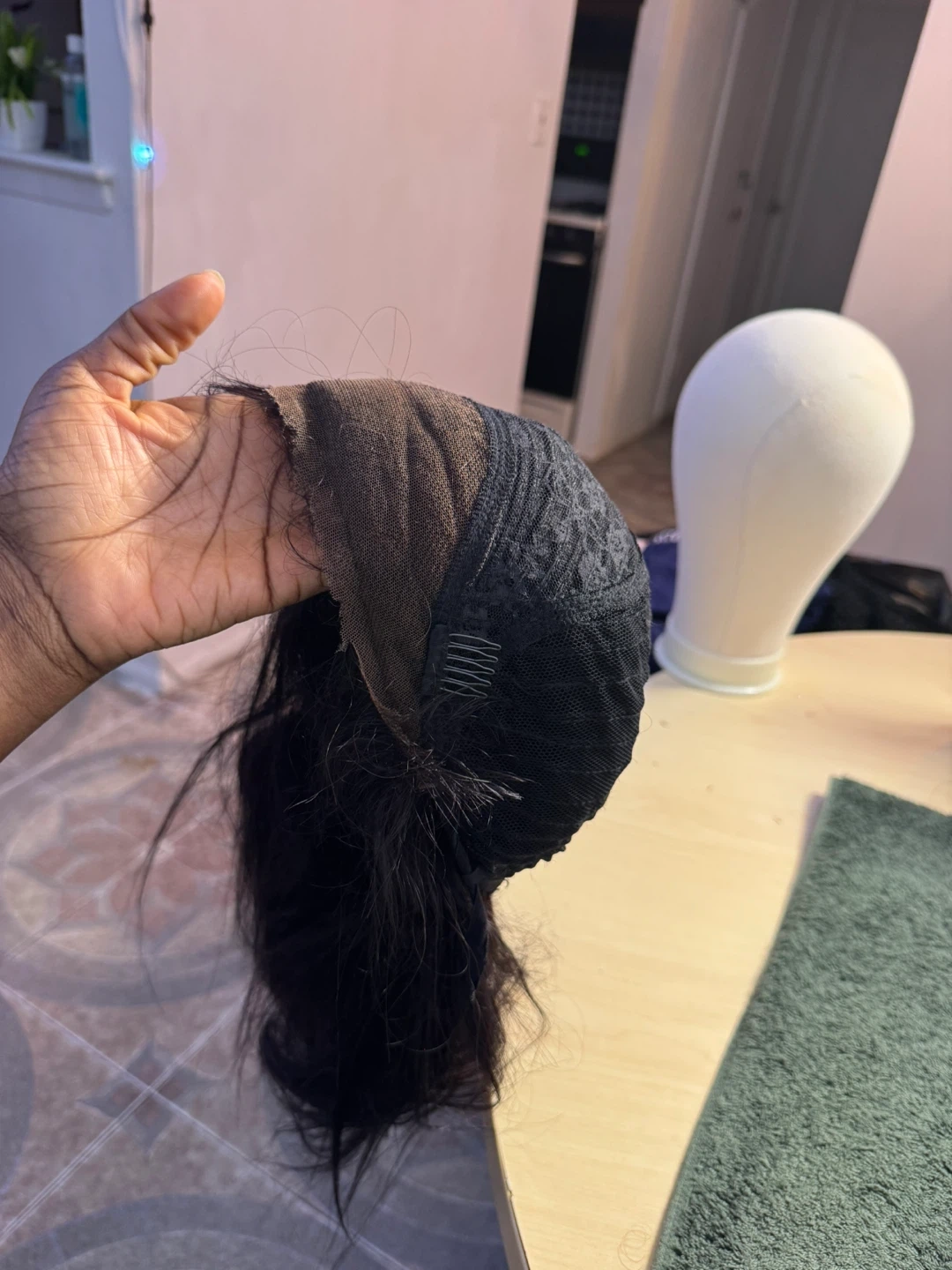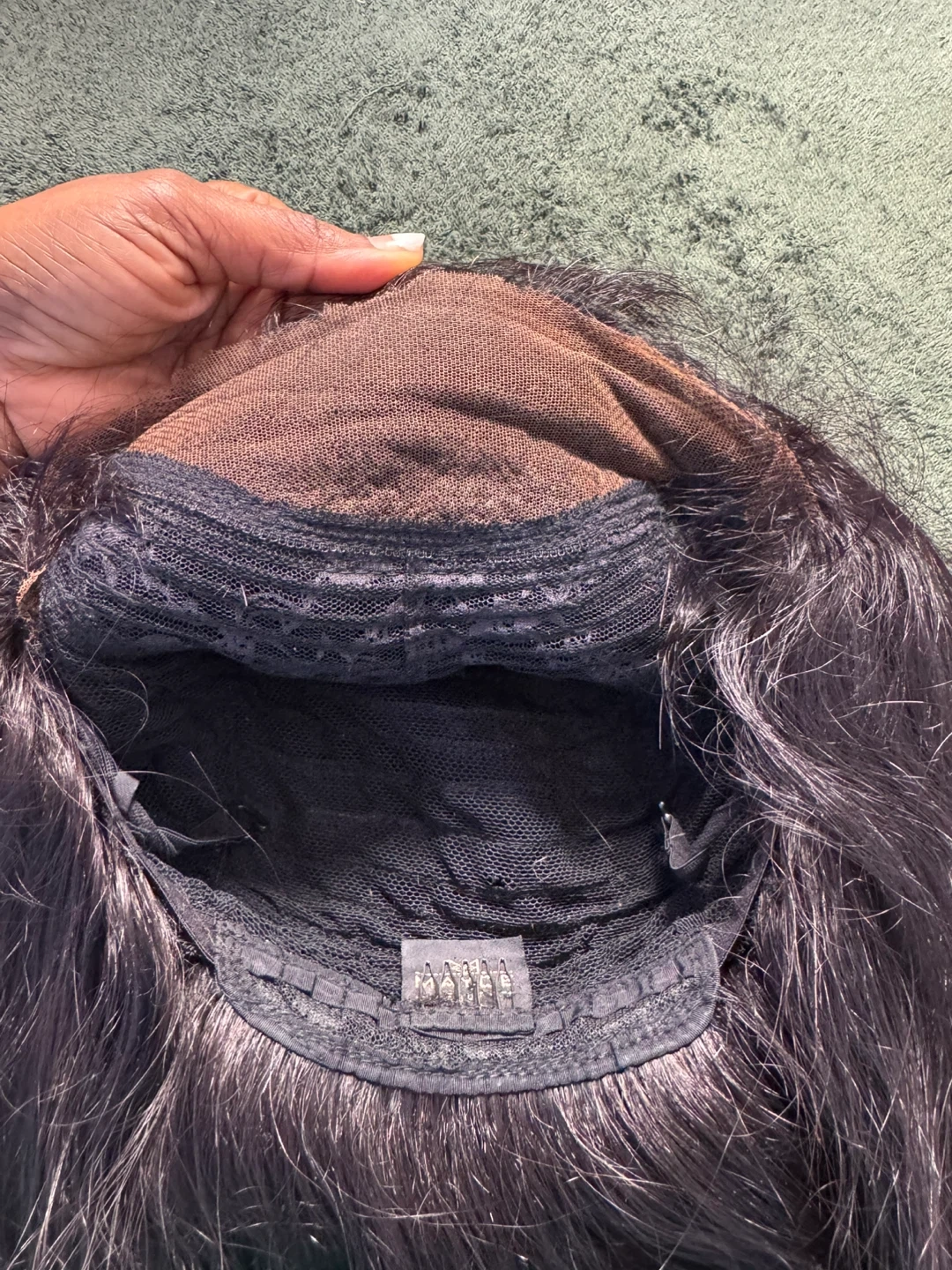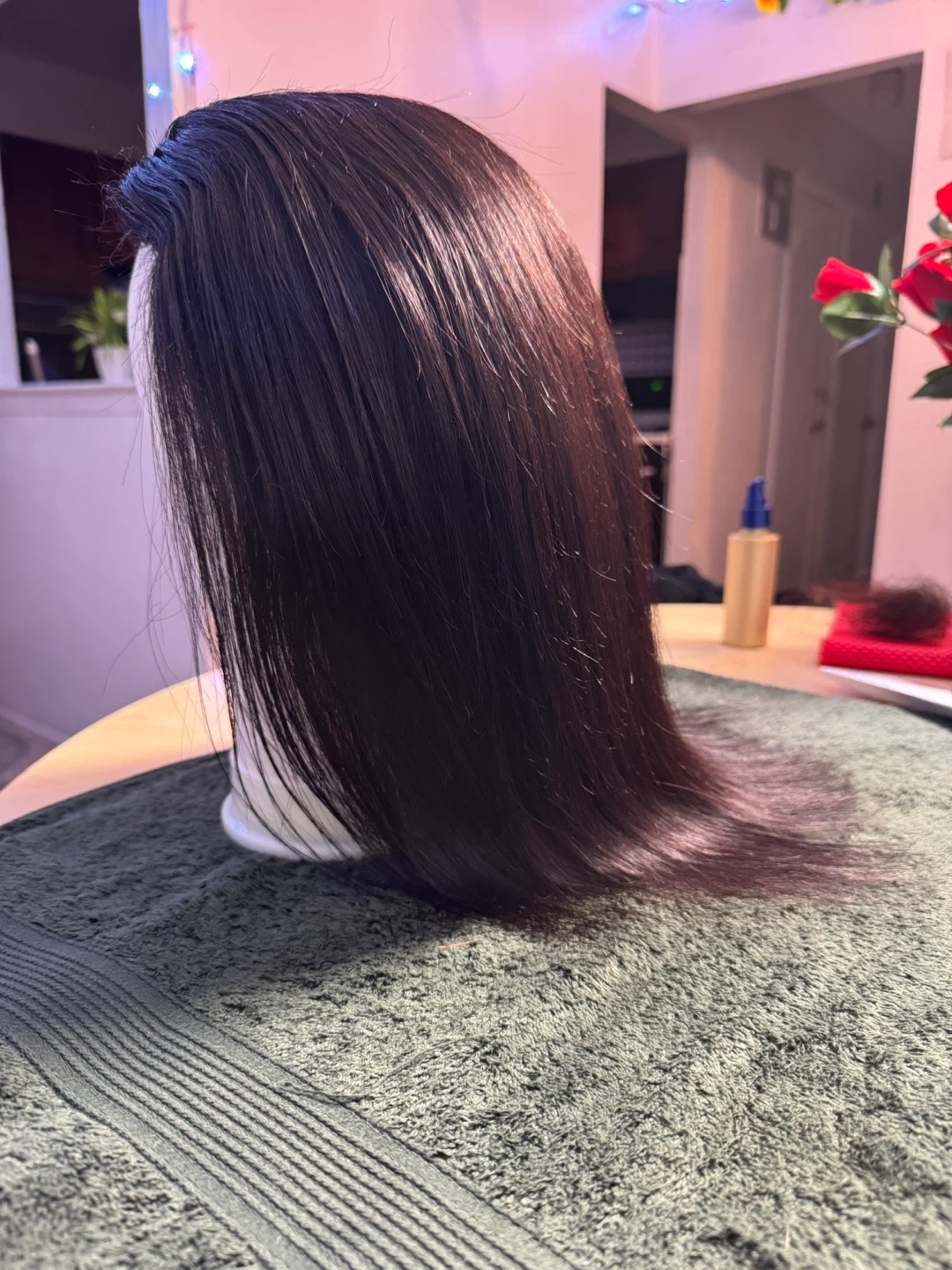This is a black, straight wig with a bob cut. It features a lace front for a natural look. Included combs for secure fit.
