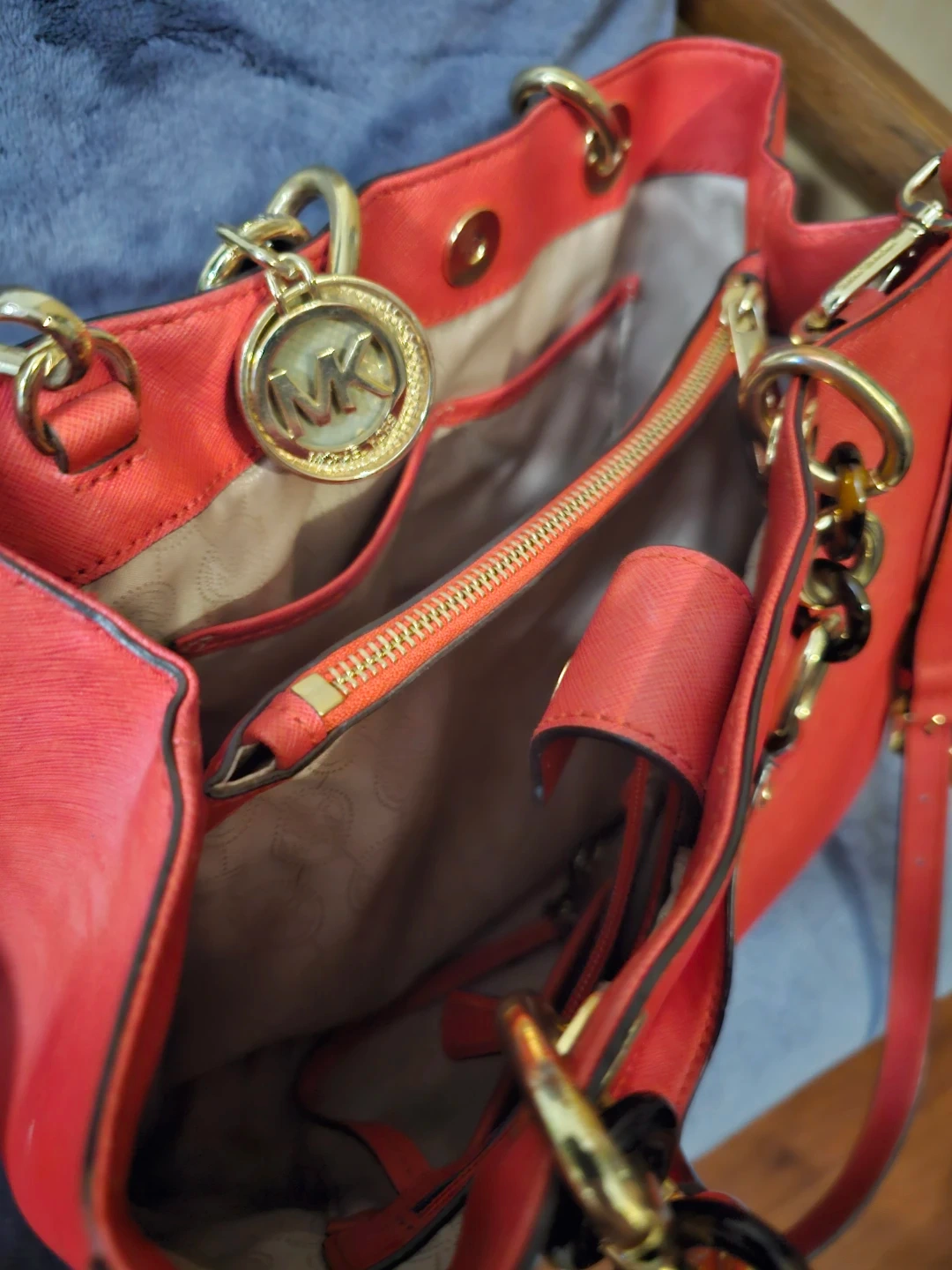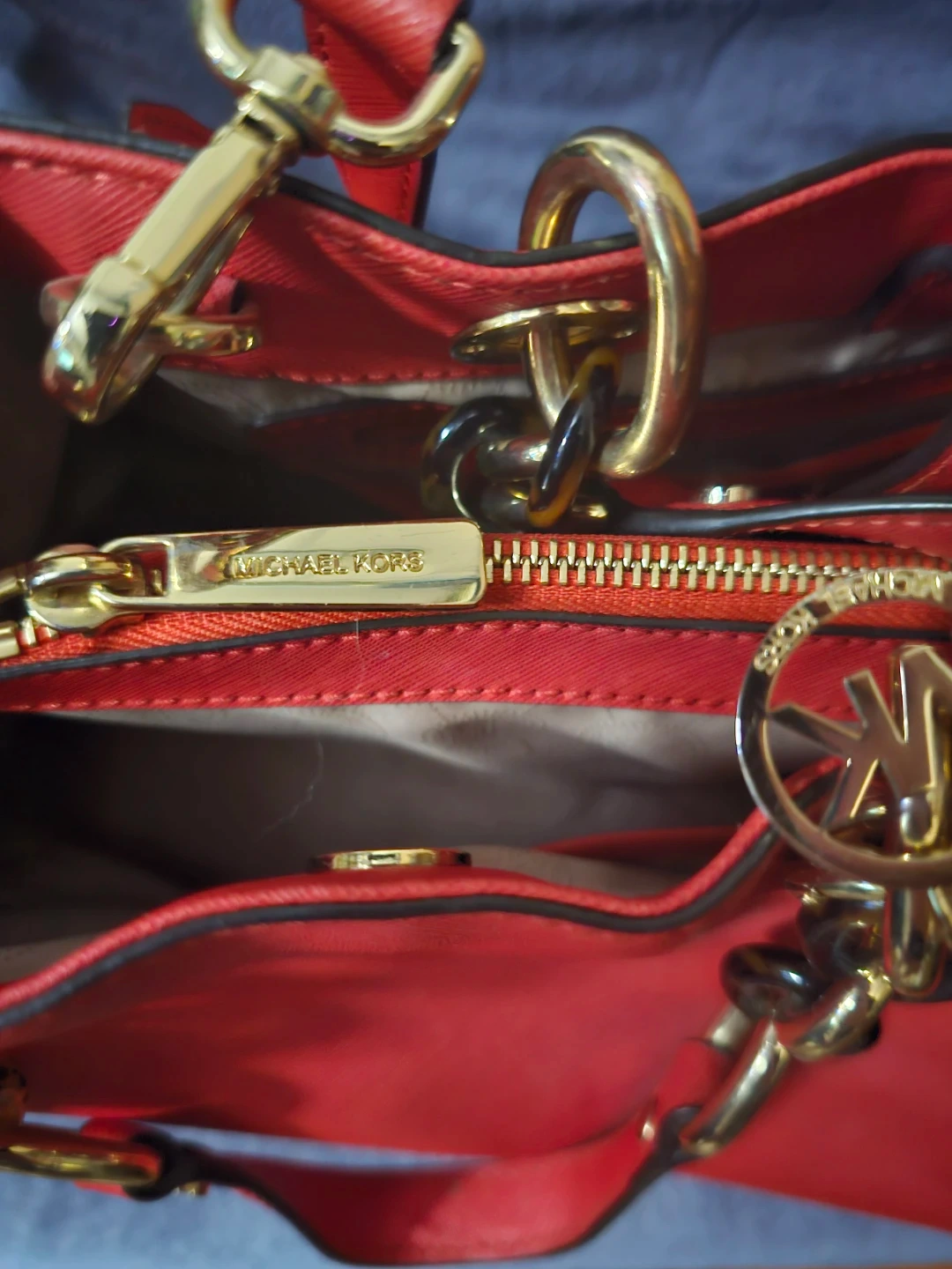 This Michael Kors satchel is made of red Saffiano leather. It features gold-tone hardware and a removable crossbody strap. Interior includes multiple pockets.