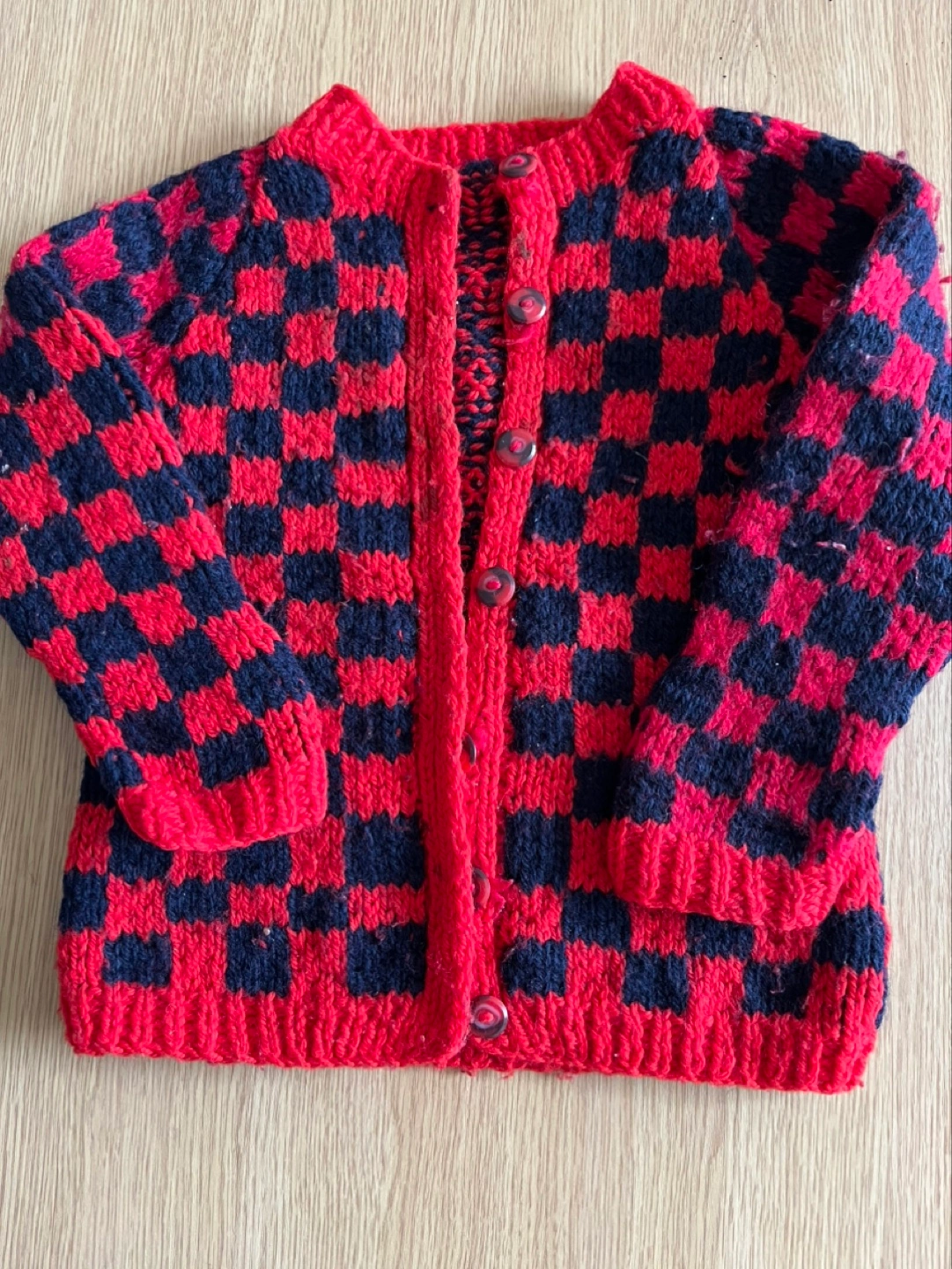 Hand knitted red and black checkered cardigan with button closure. In good condition. For age 2-4. If ad is up, the item is available.