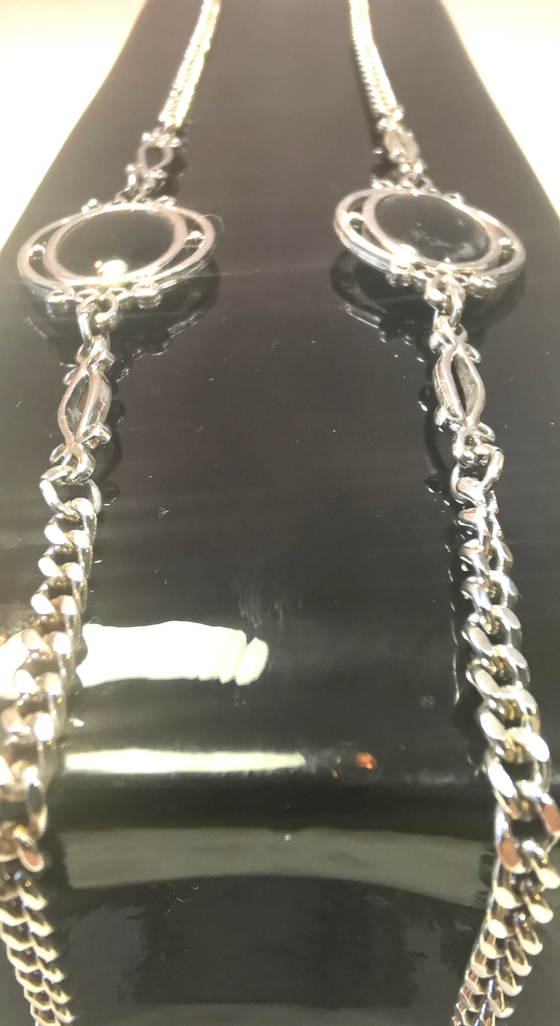 This refined vintage piece is the 1976 "Touch of Class" necklace by Sarah Coventry. It features a brilliant silver-tone specialty chain punctuated by sleek, oval black cabochon "stations." At approximately 33 inches in length, this opera-length piece is designed for versatile styling—it can be worn long for a dramatic silhouette or doubled for a layered look.