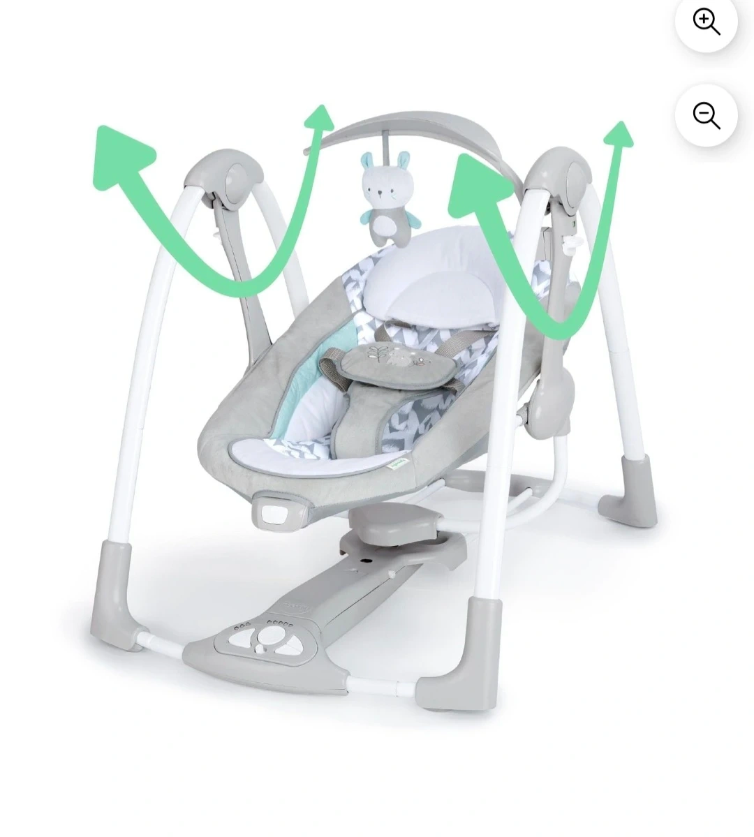 This Ingenuity baby swing features multiple soothing speeds and sounds. It's designed with a compact frame that's easy to fold for travel. The seat includes a gentle toy for baby's amusement.
