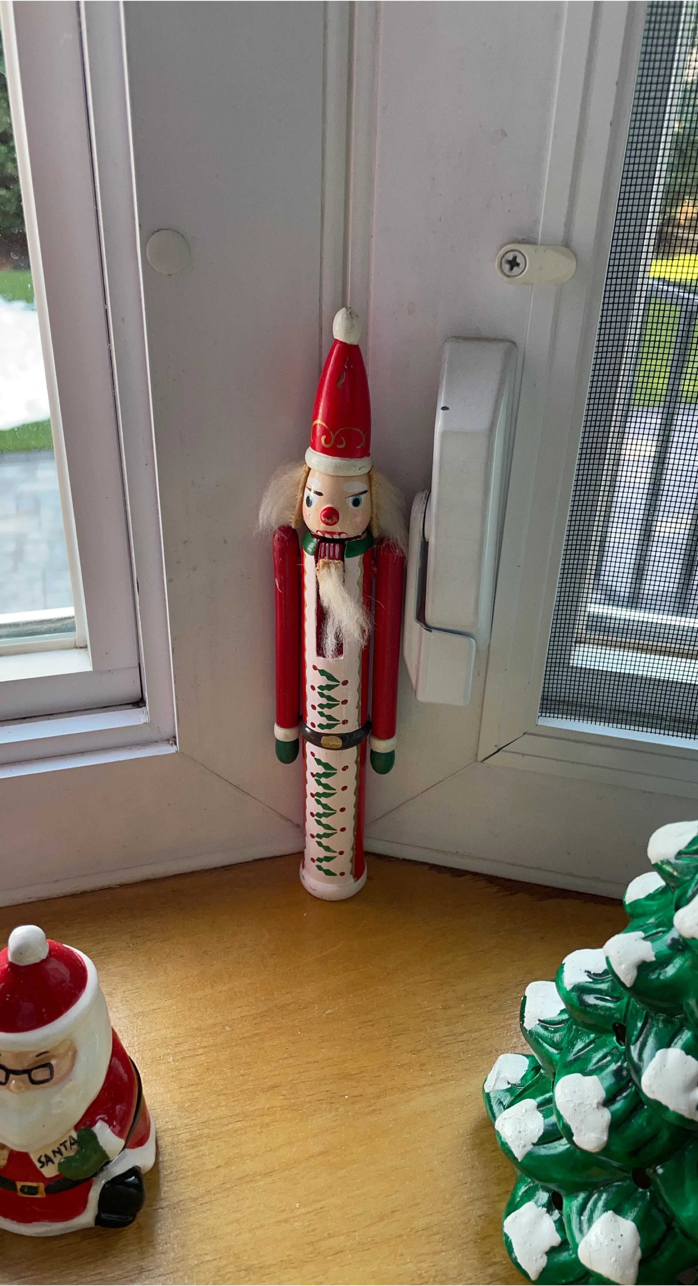 This is a wooden nutcracker decoration with a festive soldier design. It's red and white with green accents and a black belt. Perfect for holiday decor!