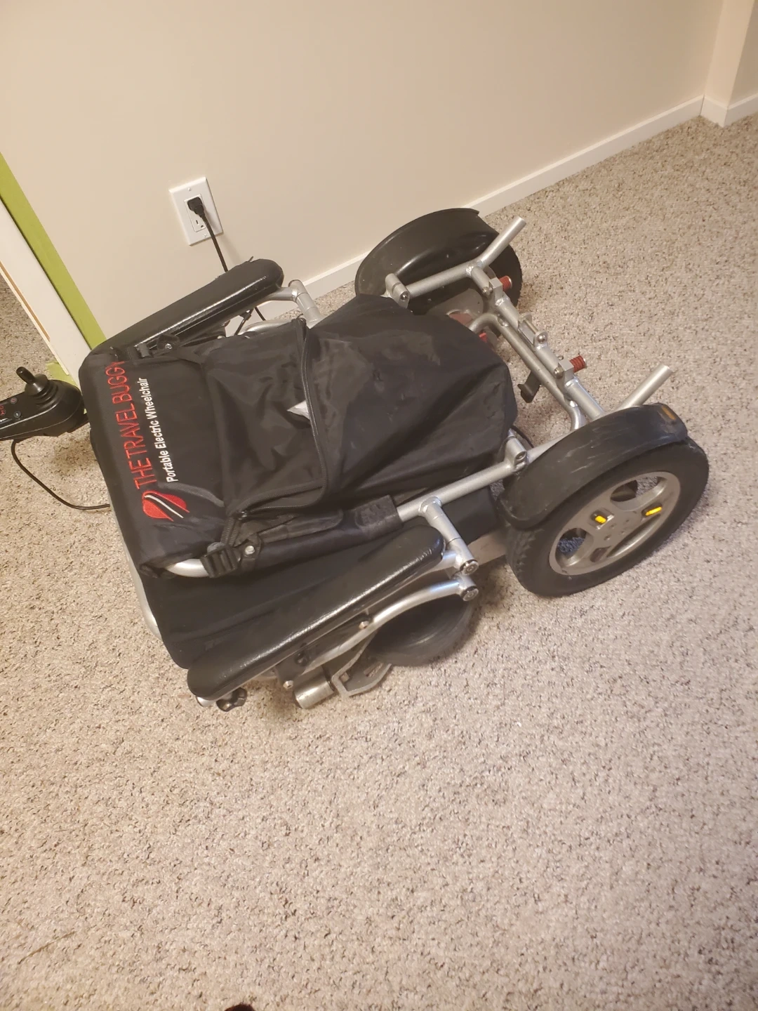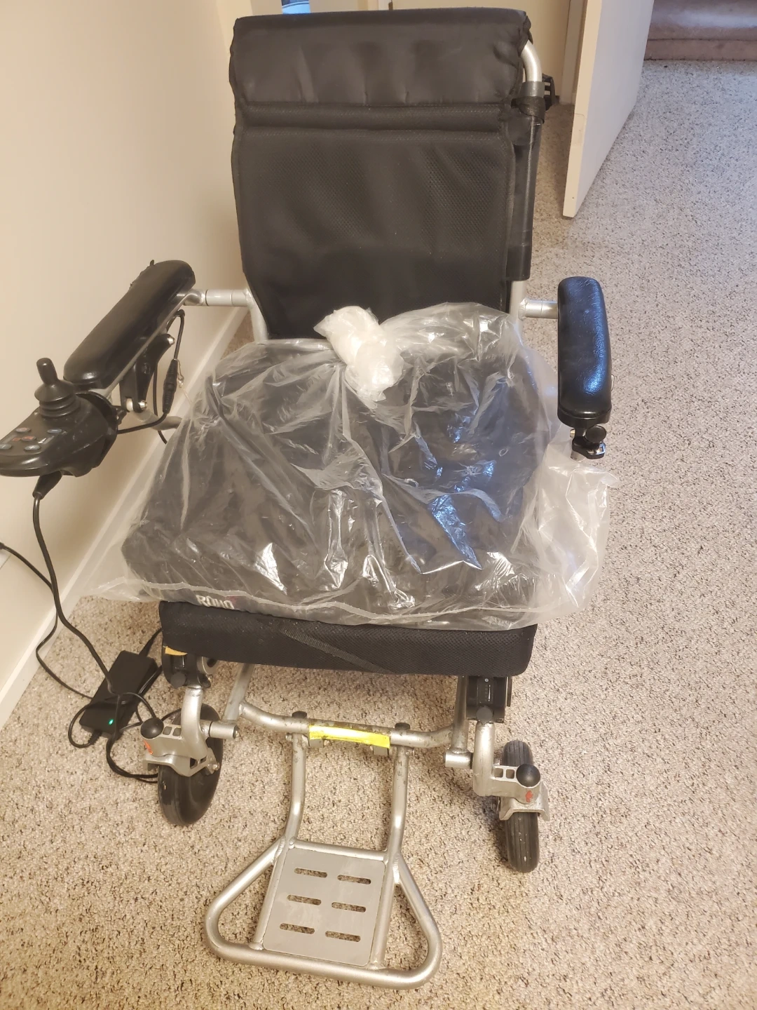 Portable electric wheelchair with a comfortable seat. It's designed for easy transport and manoeuvrability. Includes joystick controller and charging accessories. Suitable for individuals needing mobility assistance. Has a new battery. My step dad passed and I am selling it for my mom.
