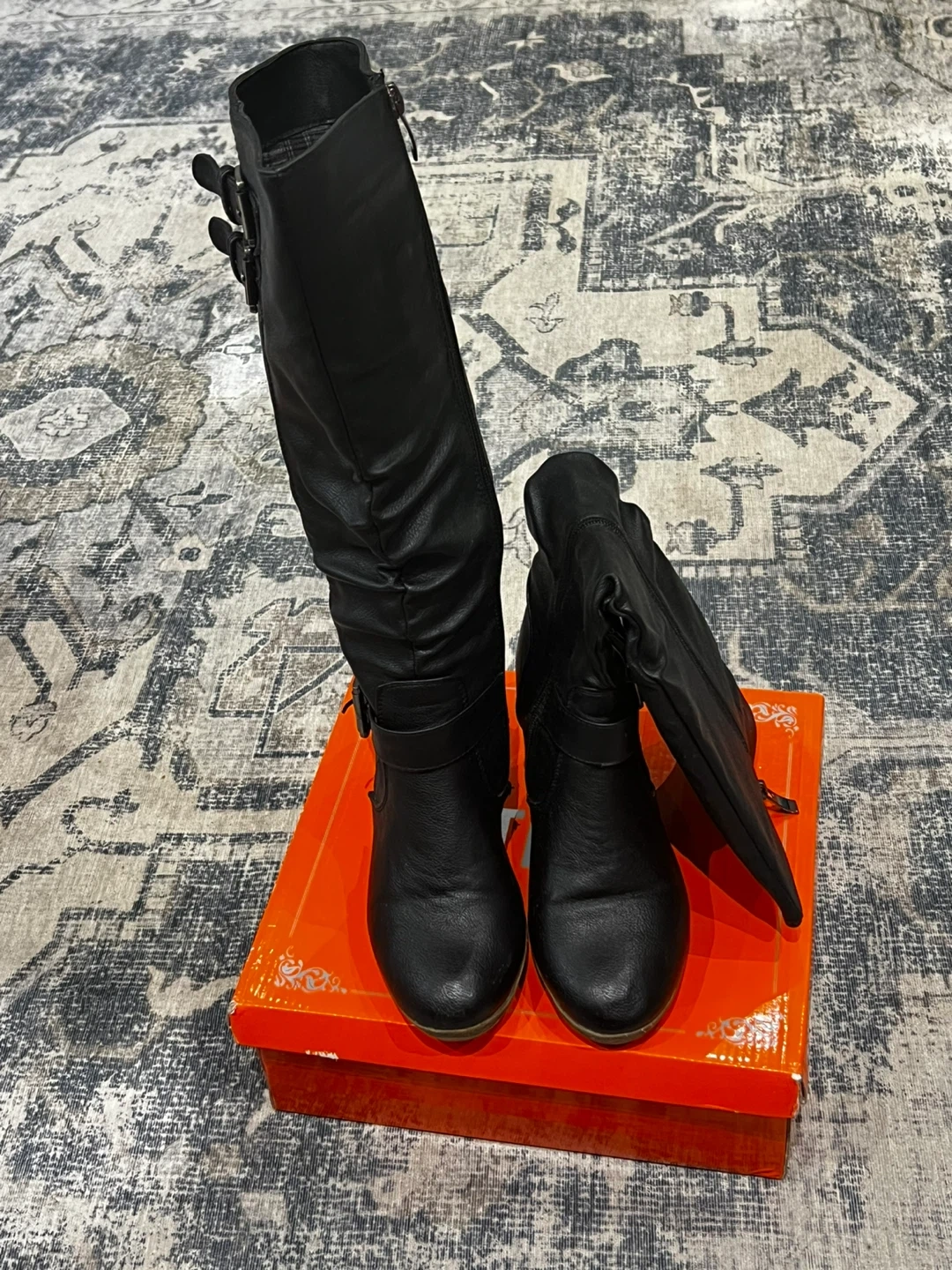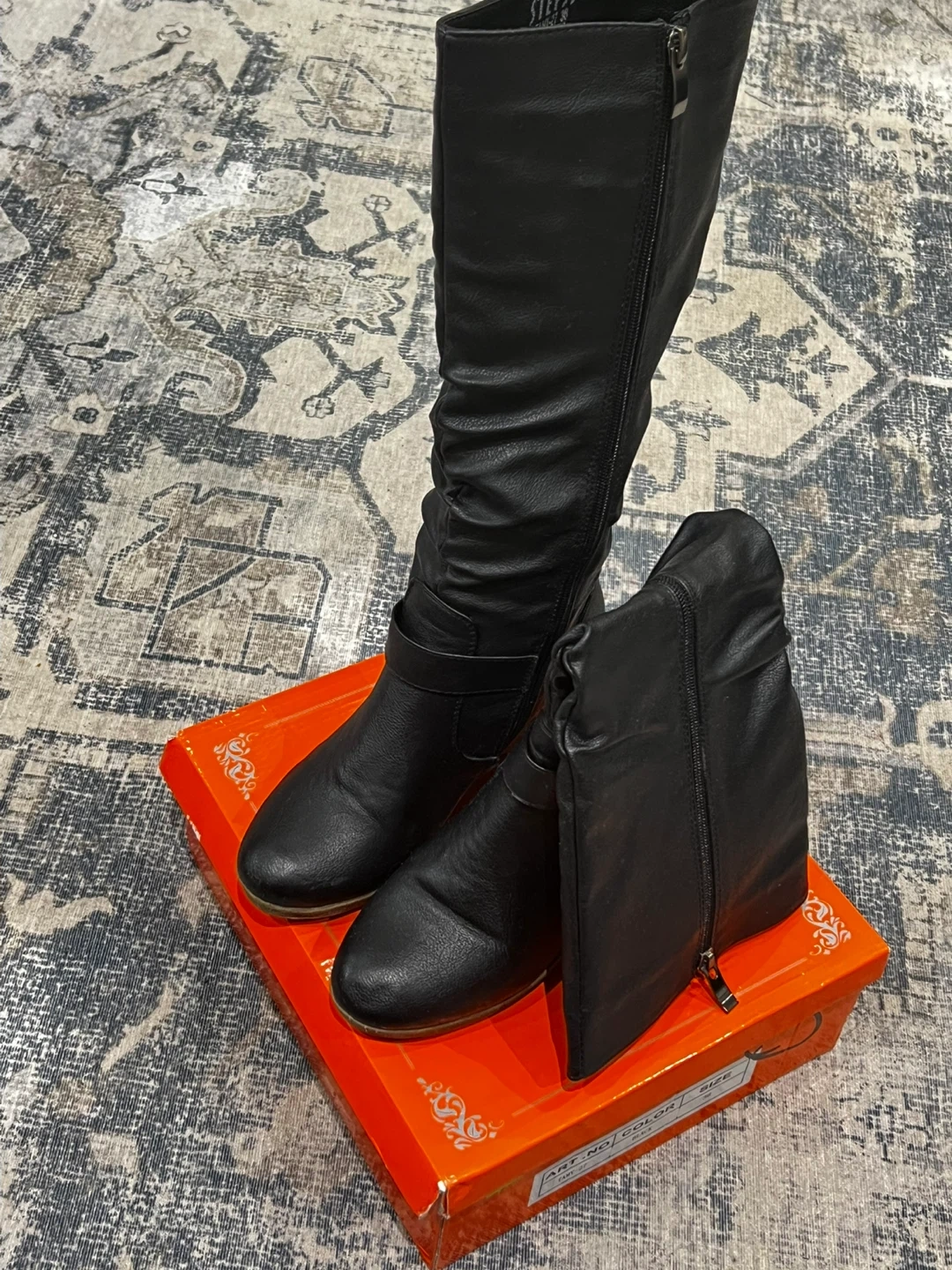 These black slouch boots are made from faux leather and feature a side zipper closure. They have a stylish buckle detail around the ankle. The shaft has a ruched design for a relaxed look. Includes original box.