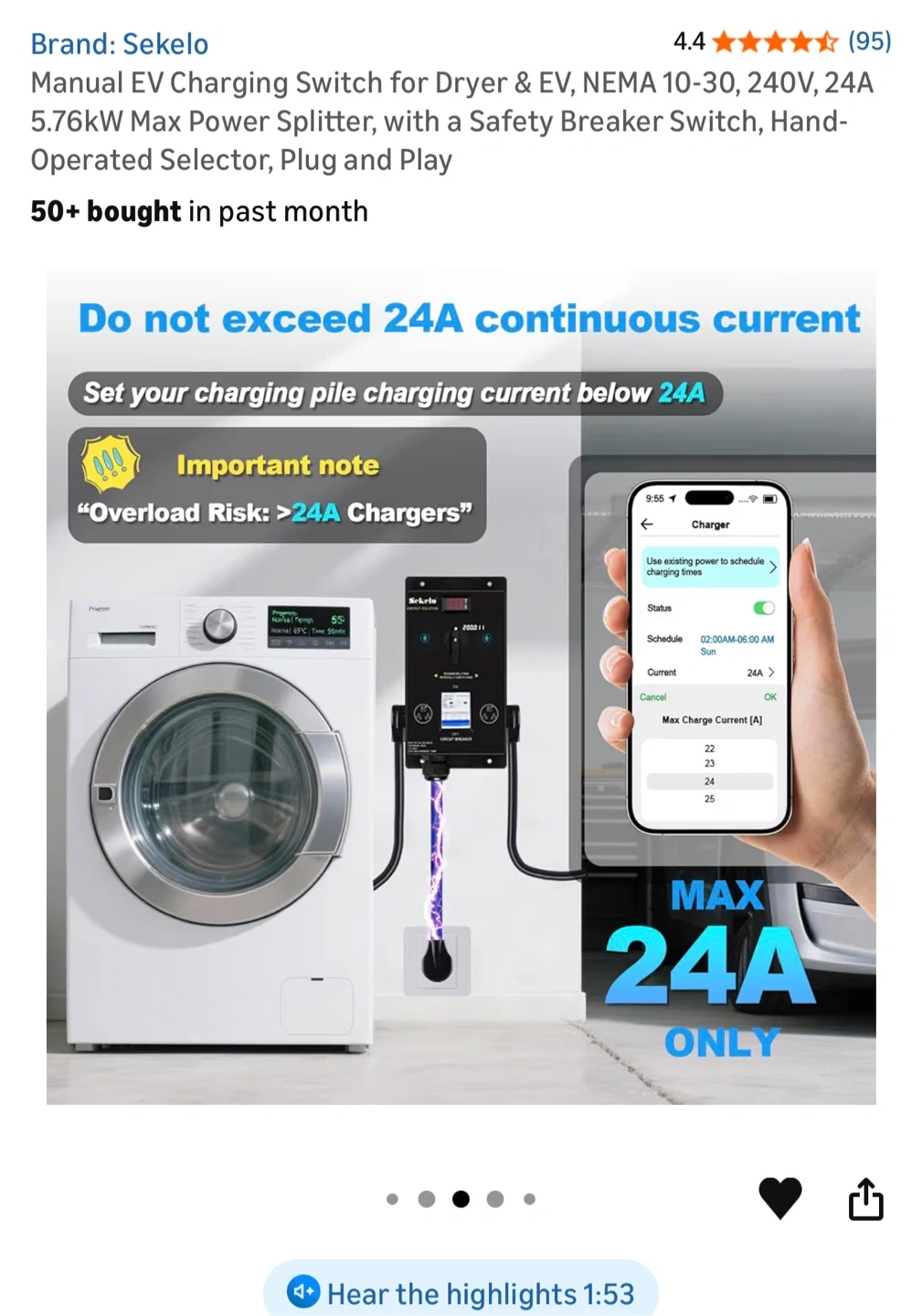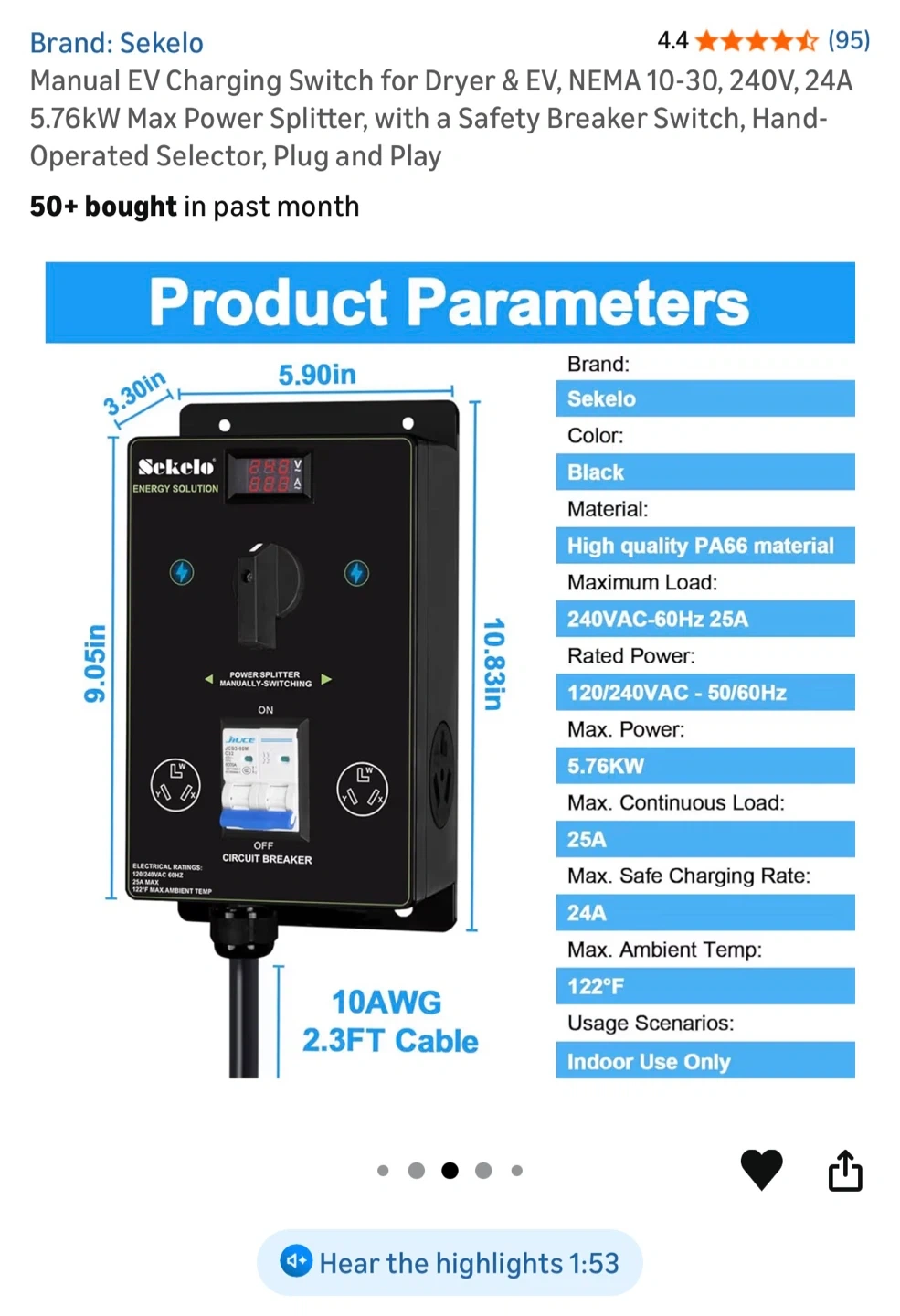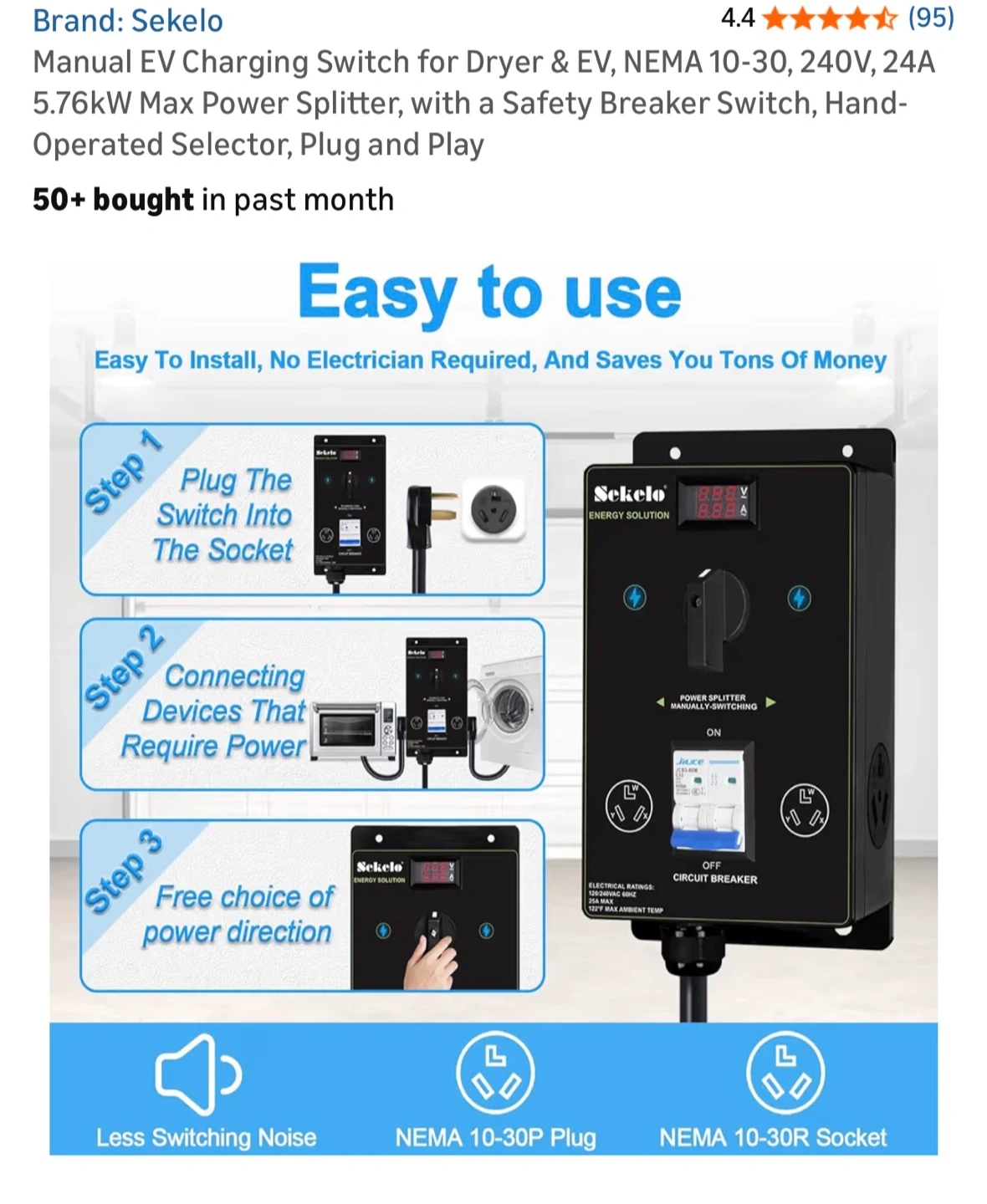 This is a Sekelo manual EV charging switch for dryers and EVs. It's a power splitter with a safety breaker switch. The unit has NEMA 10-30 sockets and a NEMA 10-30 input plug. Max load is 240VAC-60Hz 25A and max power is 5.76kW.