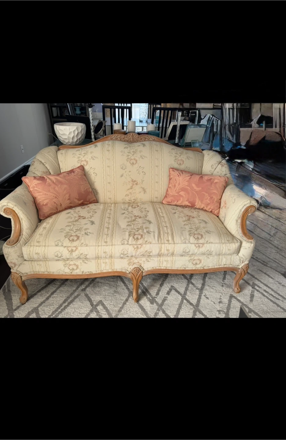 Charming vintage loveseat and sofa featuring floral pattern tapestry/upholstery. It comes with four coordinating pink throw pillows. Wood frame with elegant carved details. Dimensions: sofa 7’ long and 3’ deep, loveseat 5’ long and 3’ deep. Smoke free and pet free home. I’m excellent condition, no stains or tears.