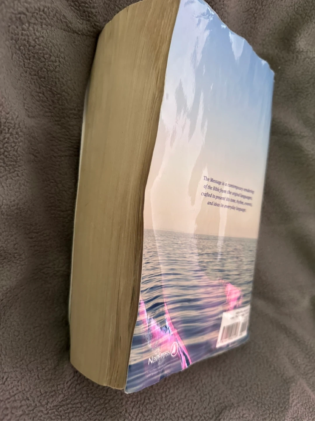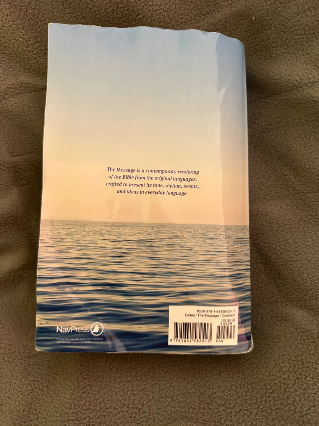 Selling a copy of "The Message" Bible in large print by Eugene H. Peterson. It's a contemporary rendering of the Bible from the original languages, crafted to present its beauty, rhythm, events, and ideas in everyday language