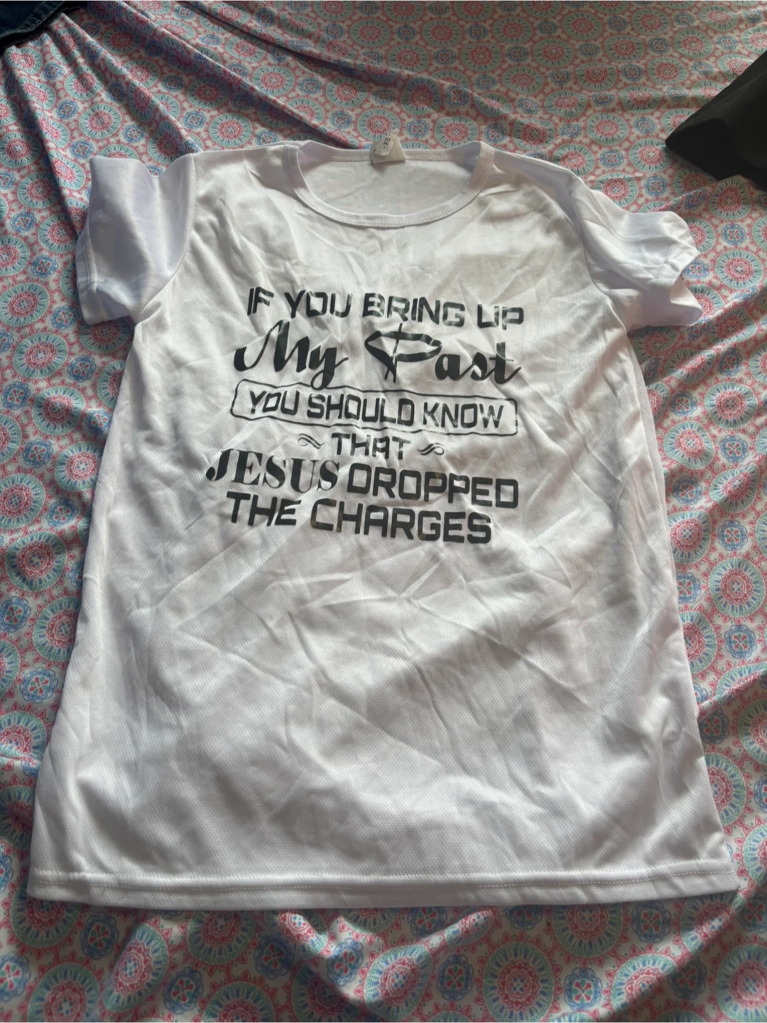 Here's a white t-shirt with a graphic print! It says: "If you bring up my past, you should know that Jesus dropped the charges".