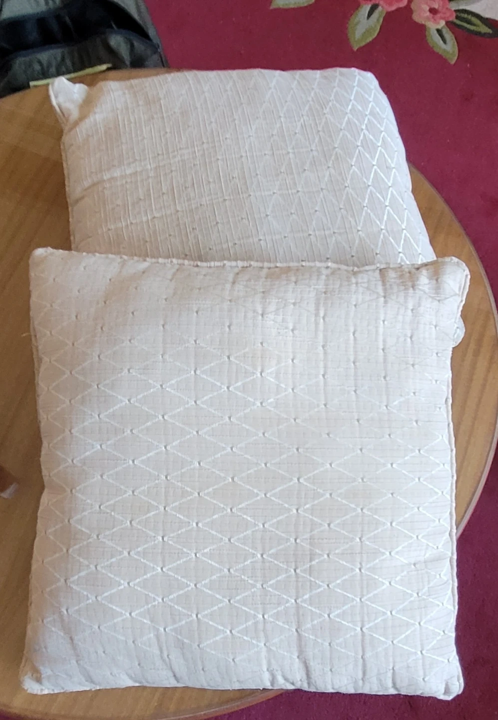 Two cream-coloured decorative throw pillows. They feature a diamond-stitched pattern with small textured dots. These pillows are perfect for adding a cozy touch to any sofa or armchair.