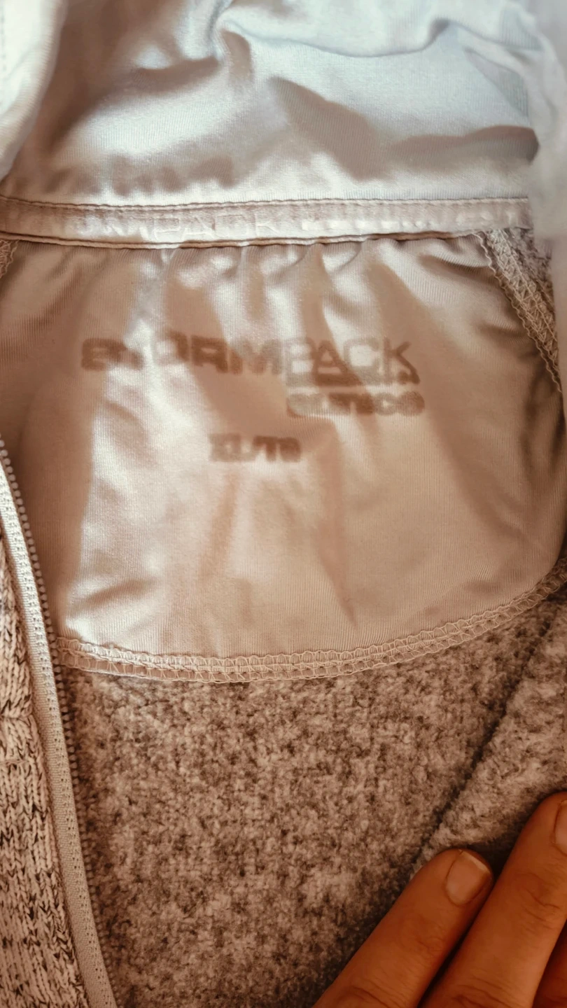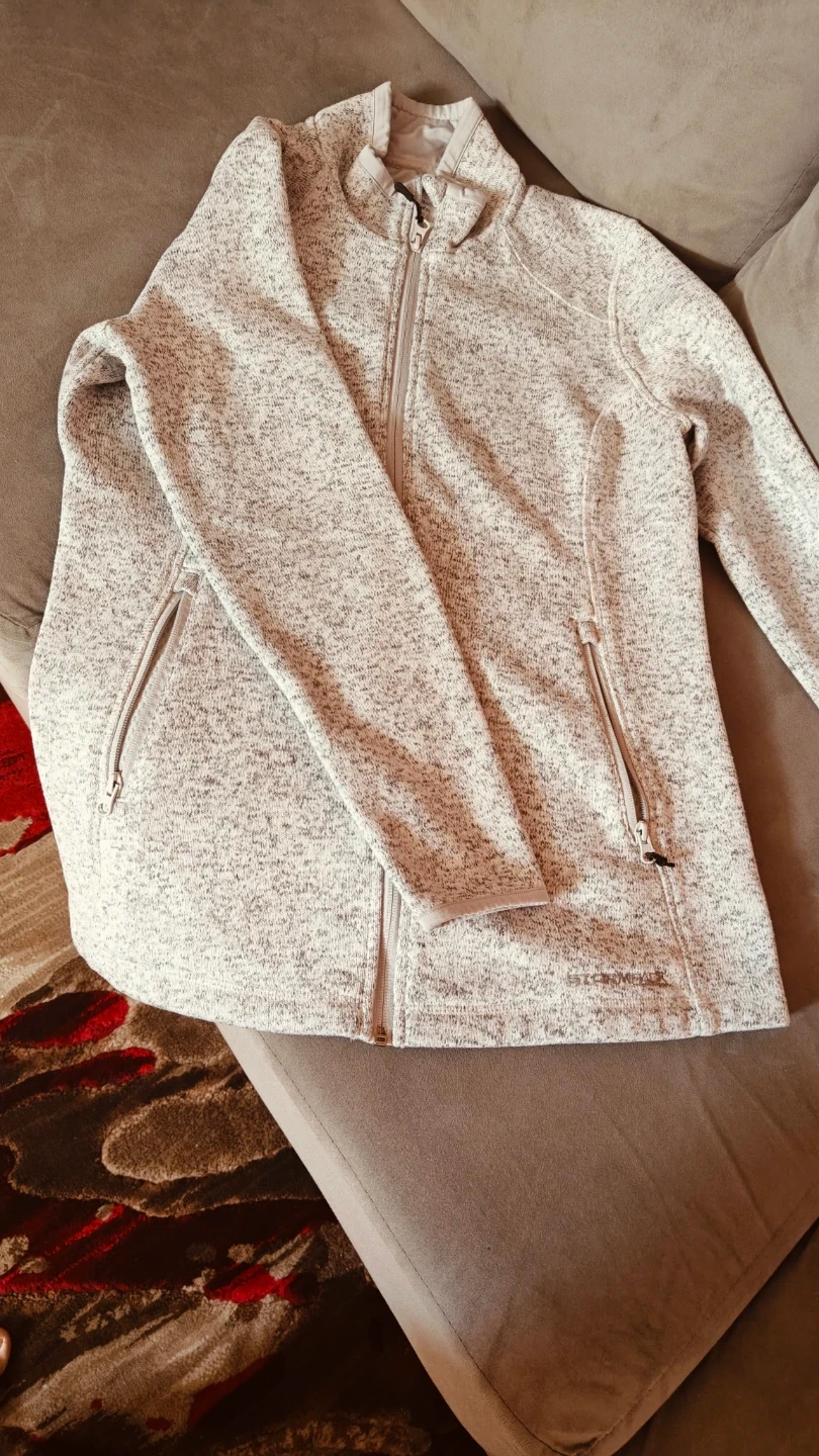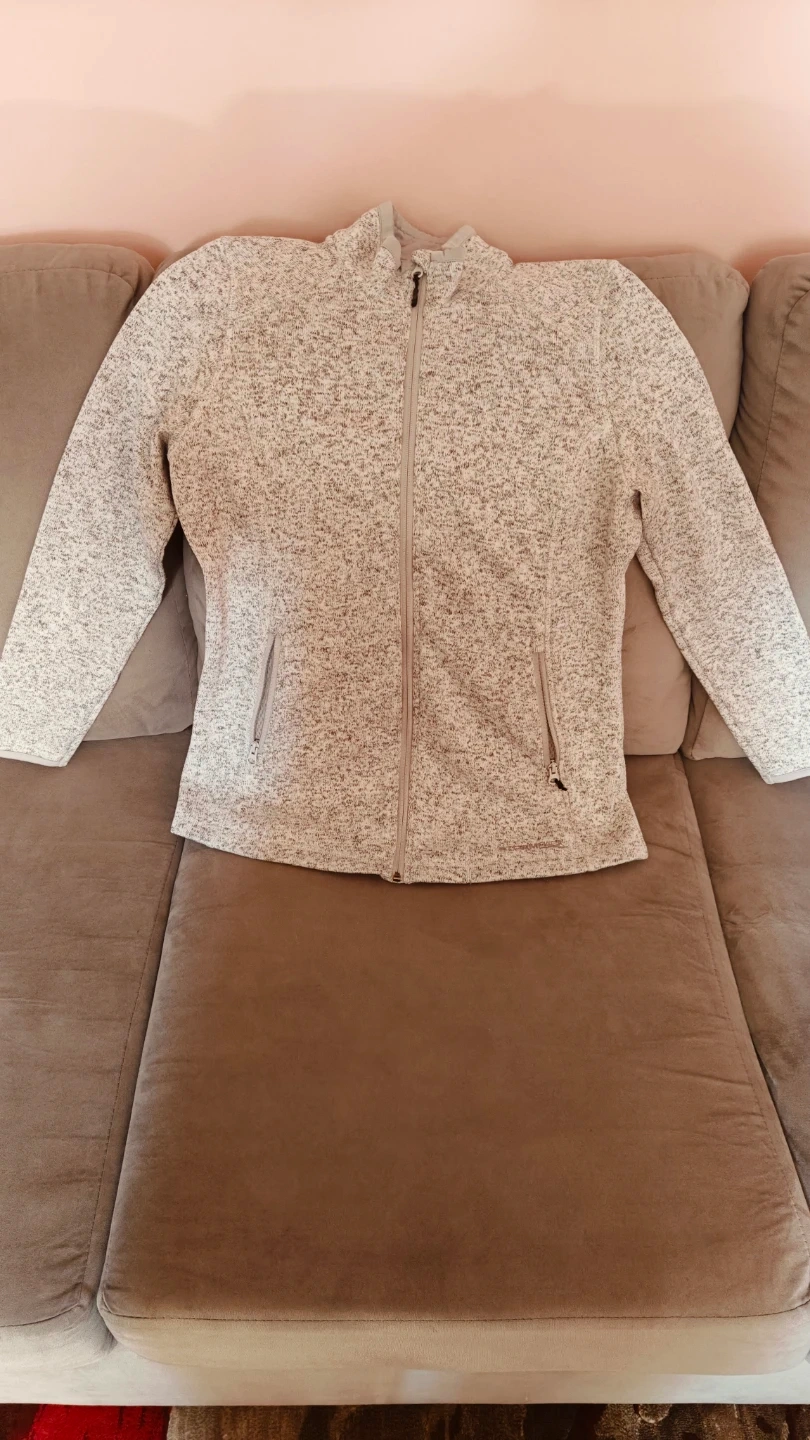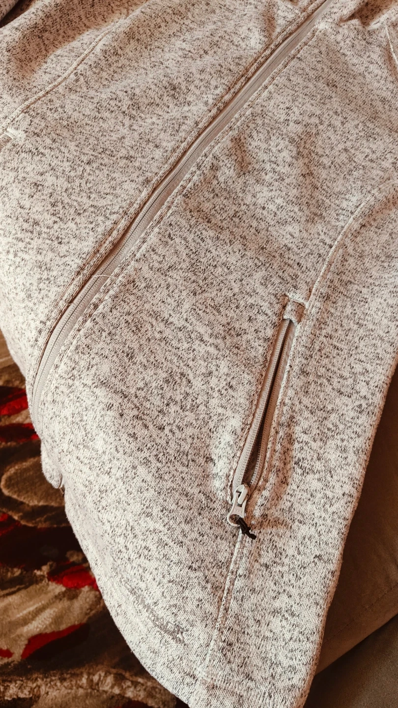 Northern Peak full-zip fleece jacket. Speckled grey and white pattern with grey trim. Features two zippered hand pockets. Size XL.