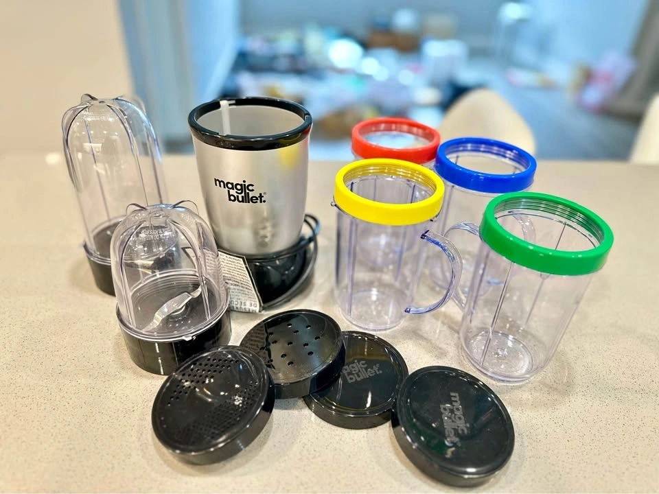 This is a 17-piece high-speed mixing system that chops, whips, and blends. The cups are made out of high-impact plastic. Includes power base, 2 blades, 2 cups, 4 mugs, 4 colored comfort lip rings, and 2 sealed lids, 2 vented lids. Let me know if you're interested!