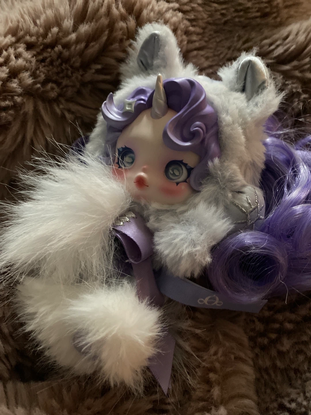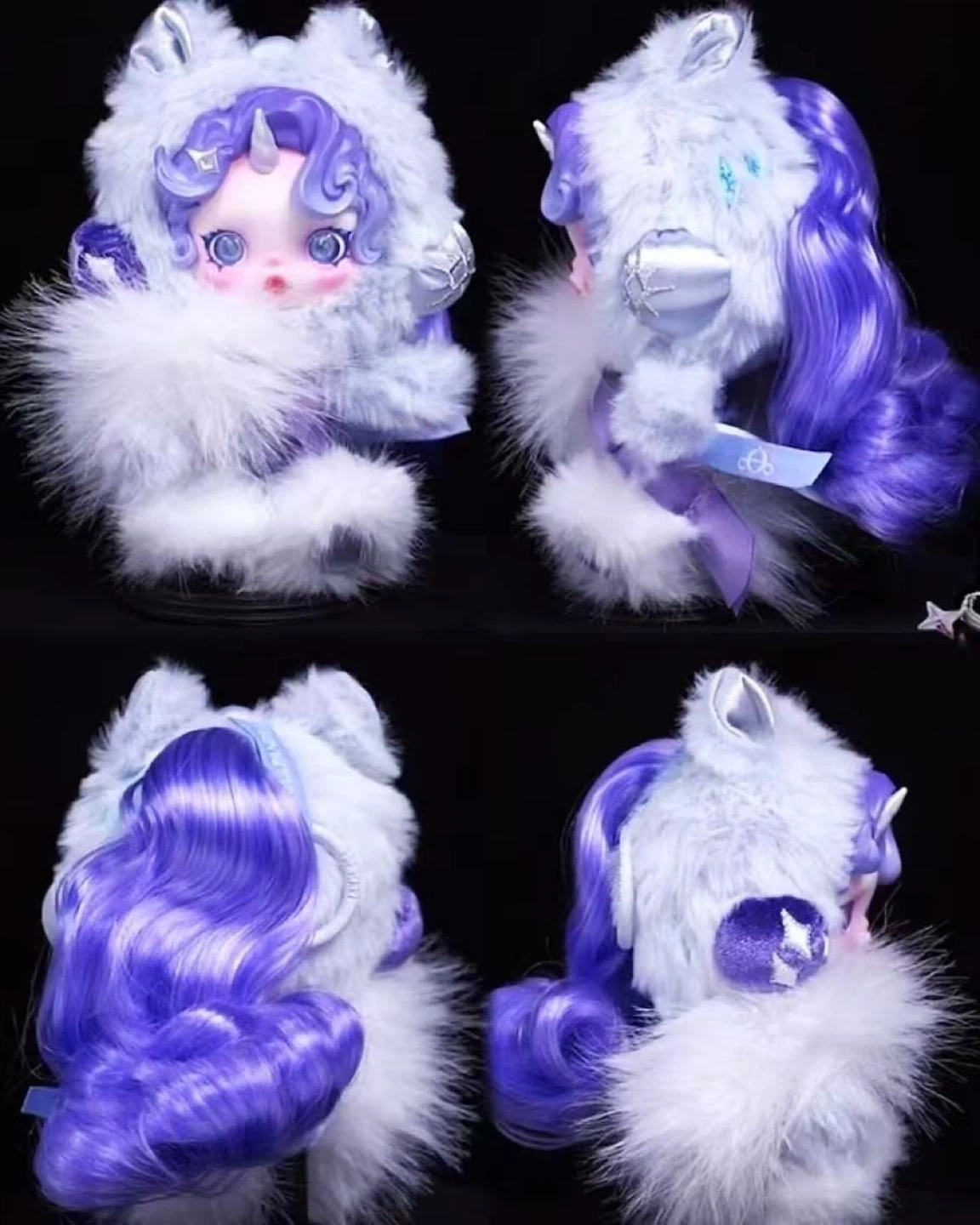 This is a blind box doll featuring a Rarity unicorn design. It's made with soft plush material and detailed face sculpt. Comes with purple wavy hair and a fluffy white and grey costume.