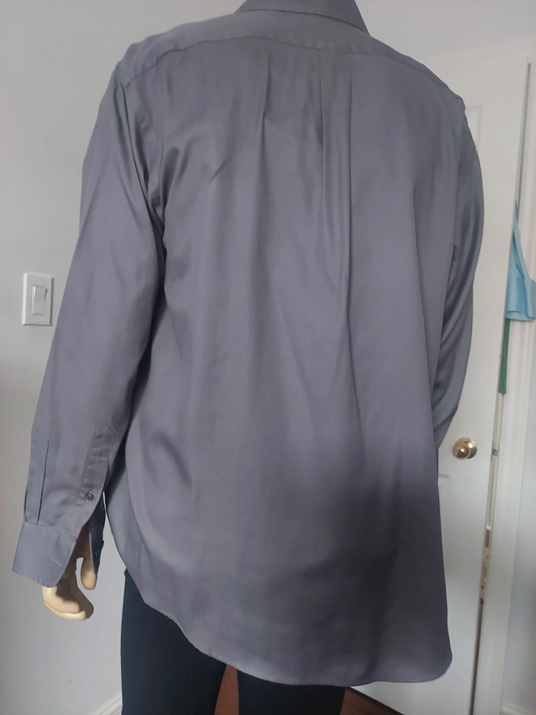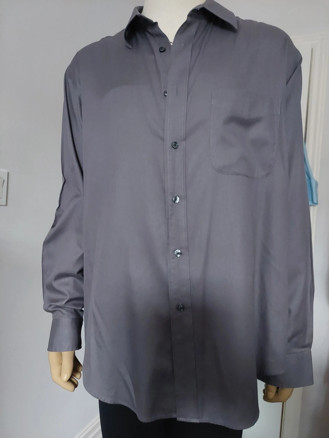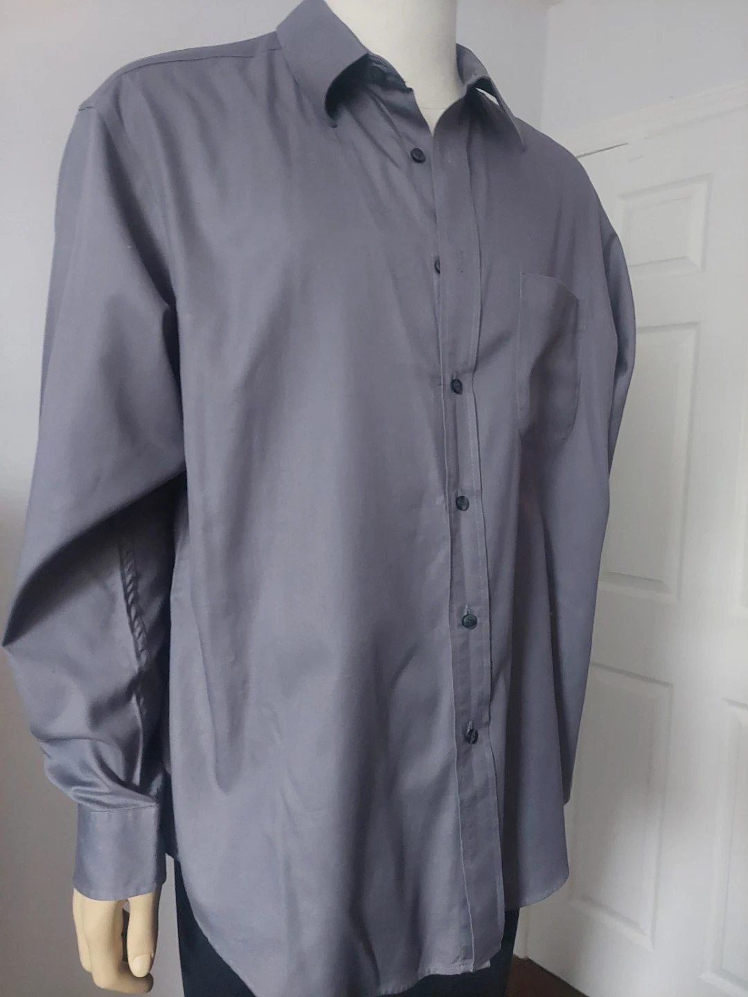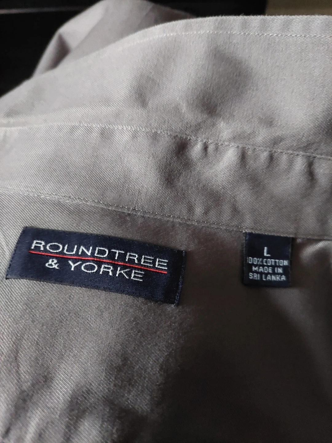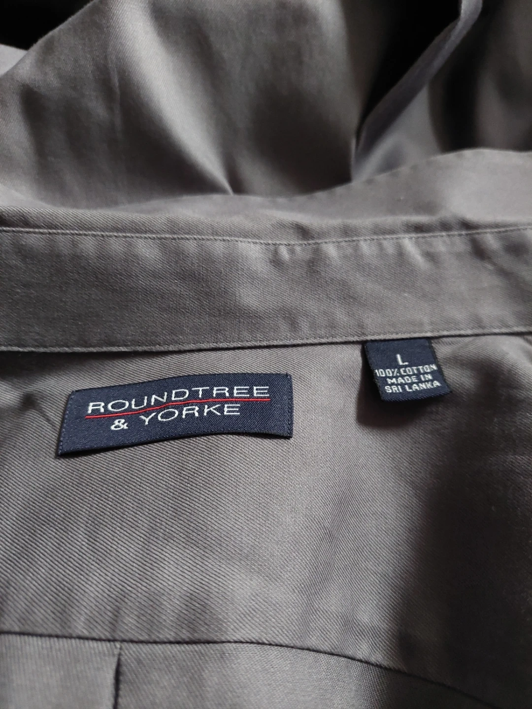 This is a men's long-sleeve dress shirt from Roundtree & Yorke. It's a size large and made of 100% cotton. The shirt is grey and features a button-up front and a single chest pocket. It's a classic button-down style. This shirt would be useful for business casual or formal occasions.