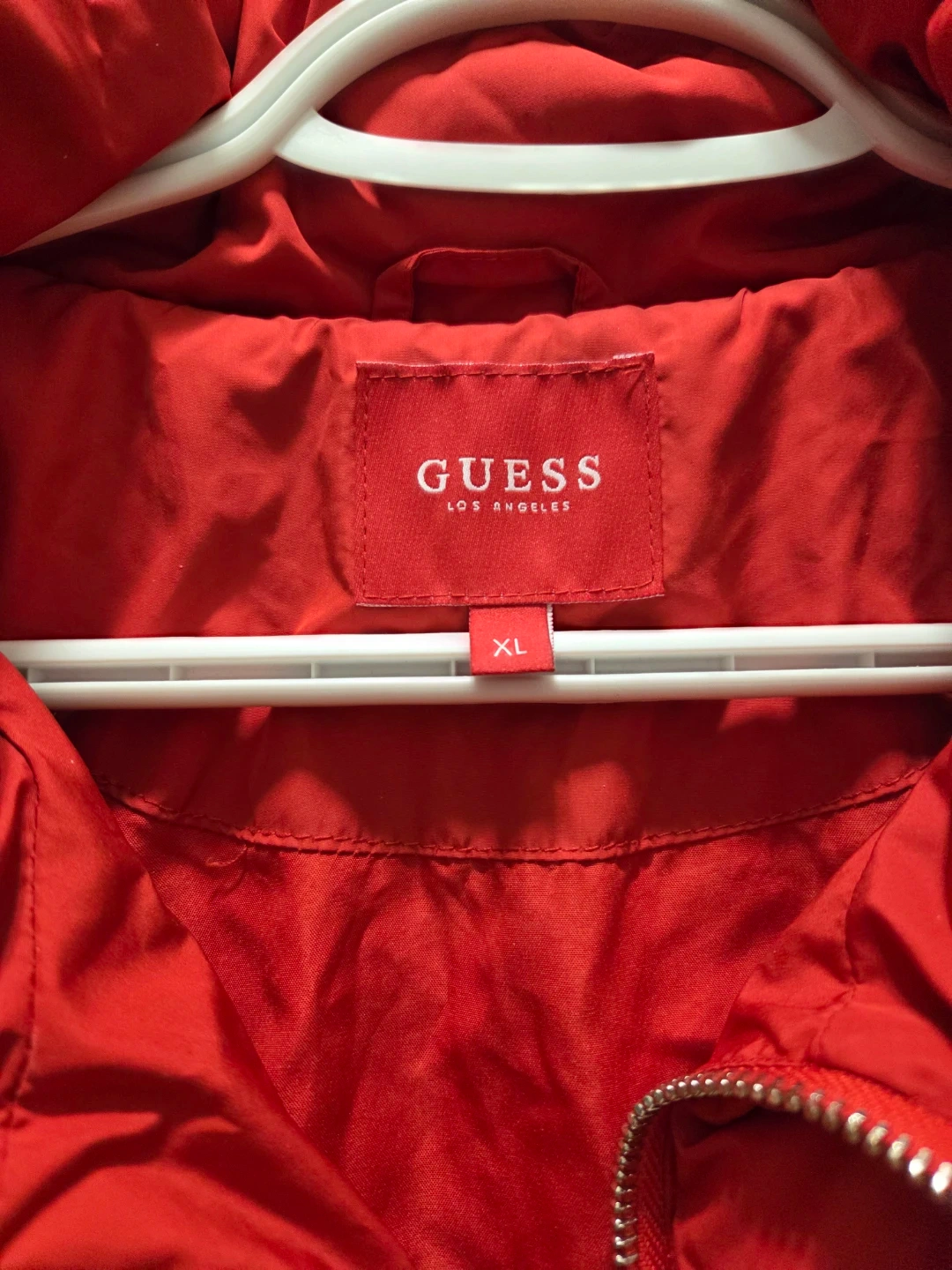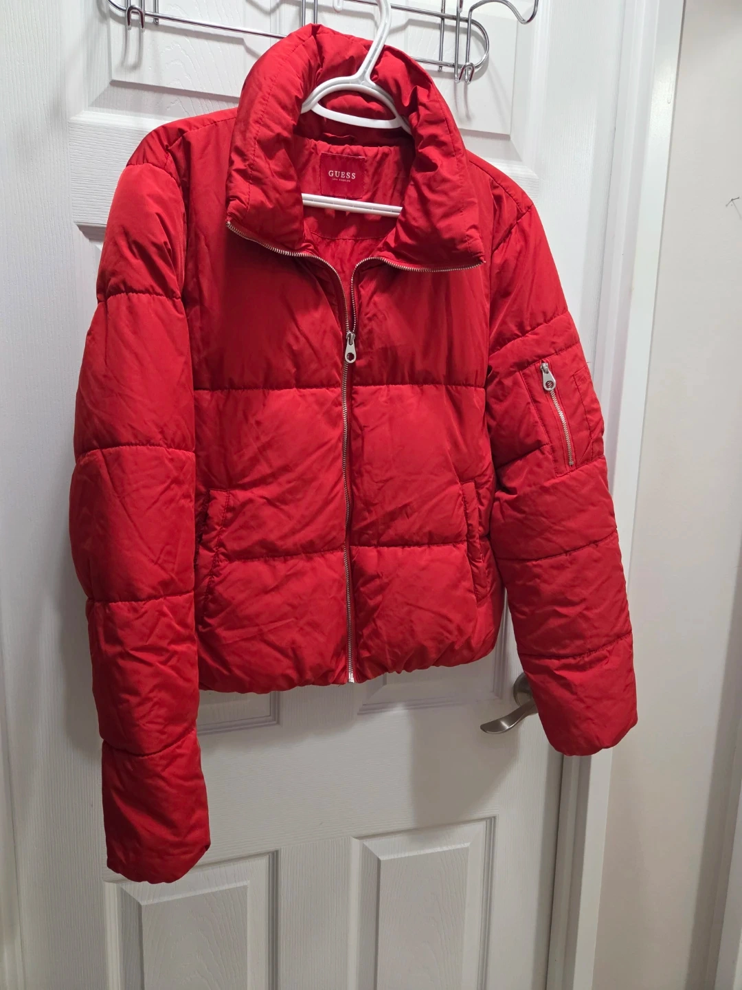 This red GUESS puffer jacket is a size XL. It features a zippered front and zippered pockets. Keep warm with this stylish puffer!