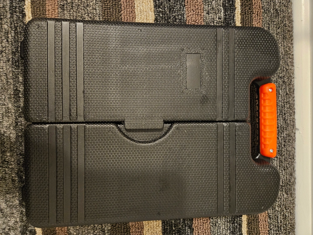Portable tool kit. Includes various screwdrivers, sockets, pliers, a hammer, a tape measure, and a level. Great for small repairs around the house. All tools stored in a plastic carrying case. Never used.