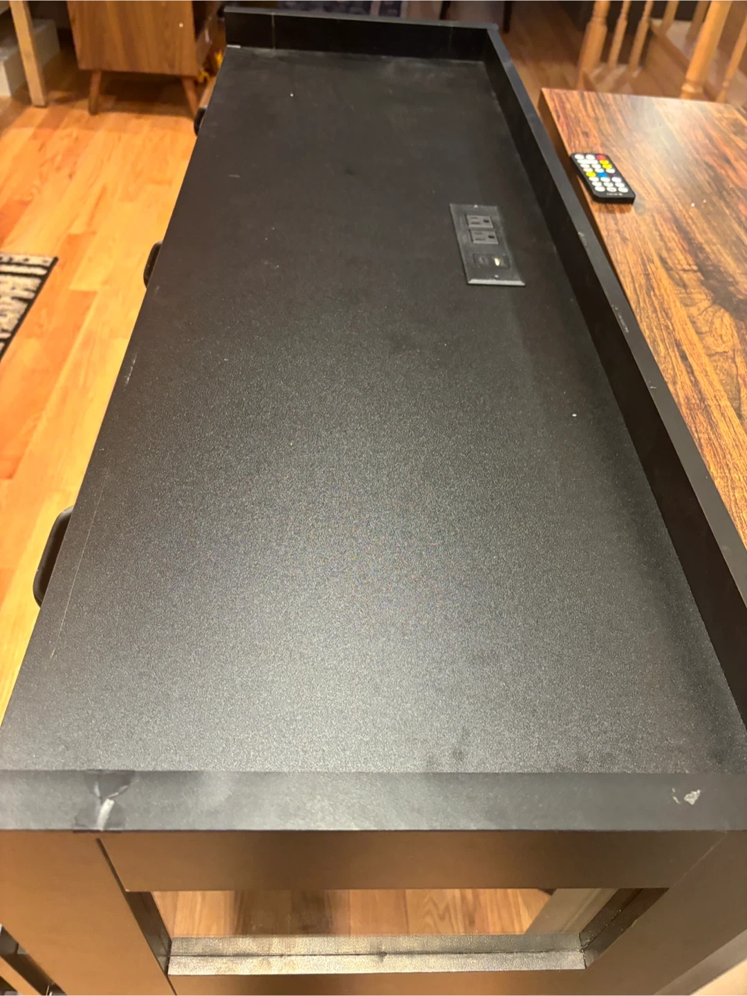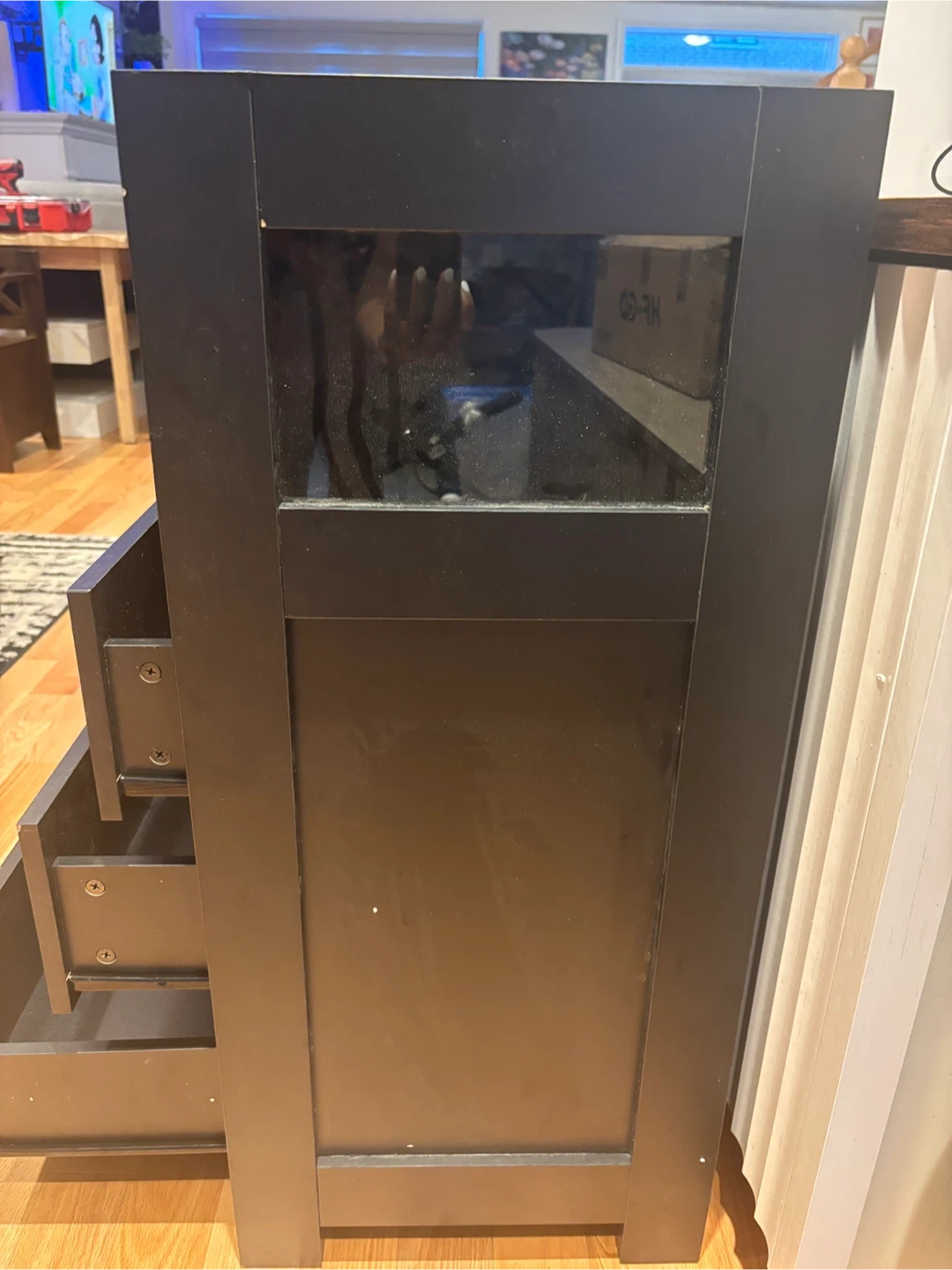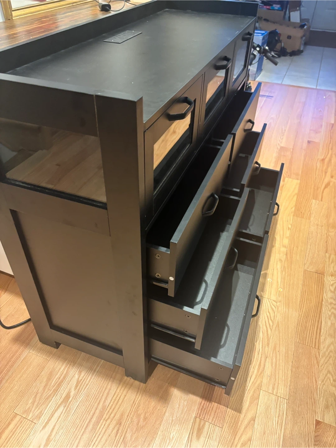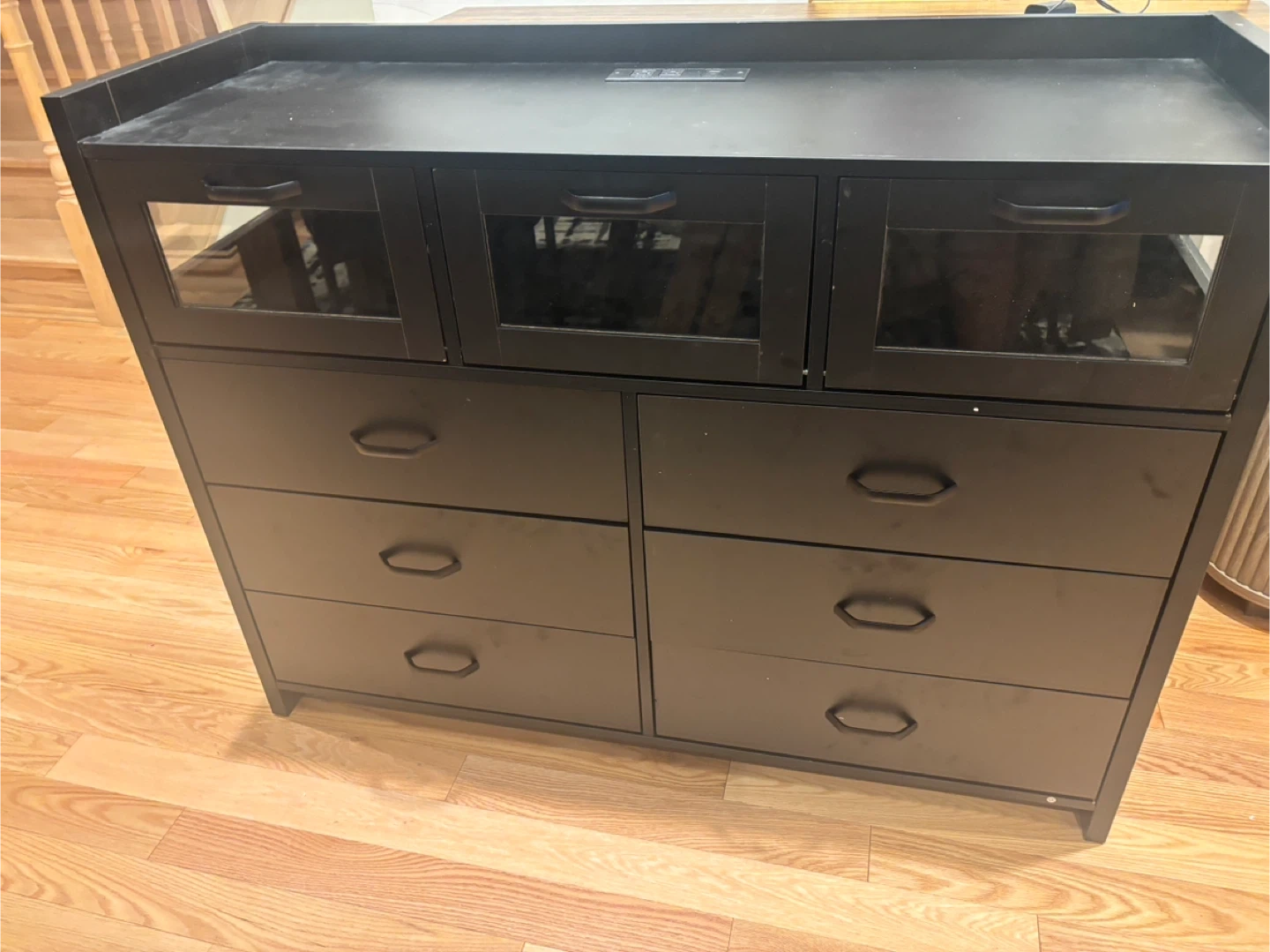 This black dresser features six drawers and three glass-fronted cabinets. It also has a built-in power outlet on the top surface. Great for storage! Available for pickup and delivery.