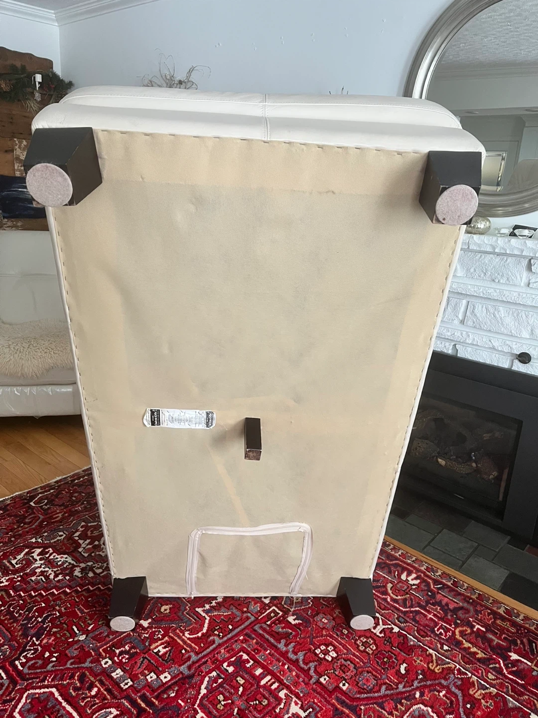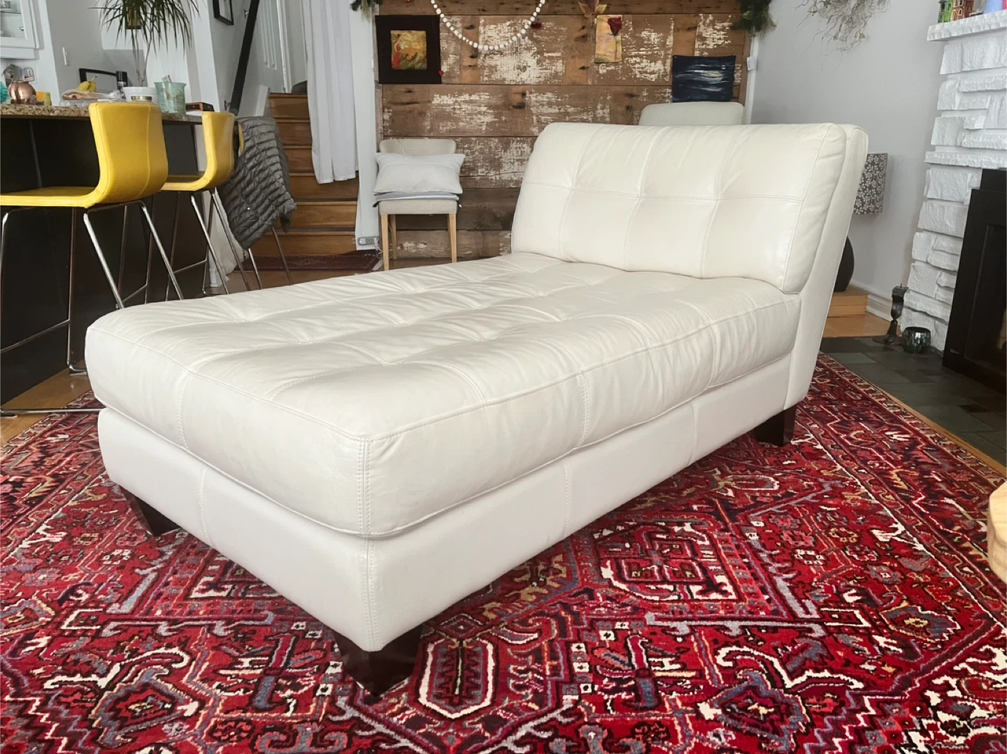 This cream leather chaise lounge offers comfortable seating with a stylish tufted design. It's upholstered in soft leather for a luxurious feel. Perfect for relaxing in your living room or bedroom.