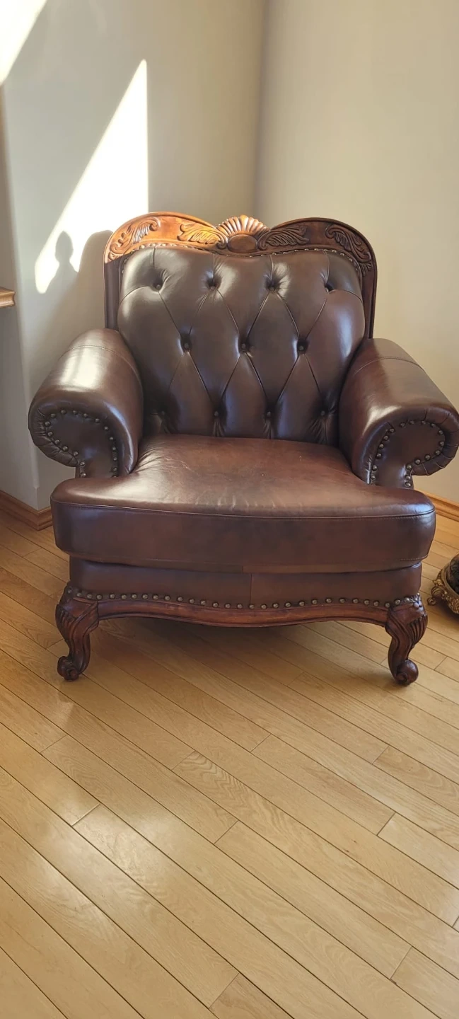 This is a stylish brown tufted leather accent chair. It features ornate wooden details on the legs and back, with studded trim along the base and arms. Its classic design adds a touch of elegance to any room.