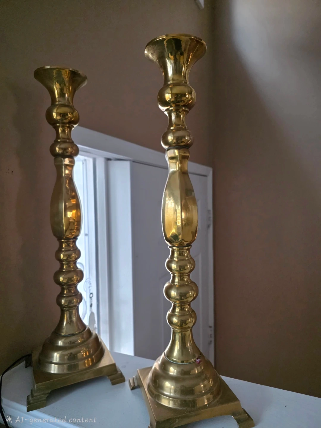 Two tall, decorative brass candlesticks. Each features a square base and an ornate, turned stem. They're perfect for adding a touch of elegance to any room. Holds standard taper candles. Purchase from Dubai