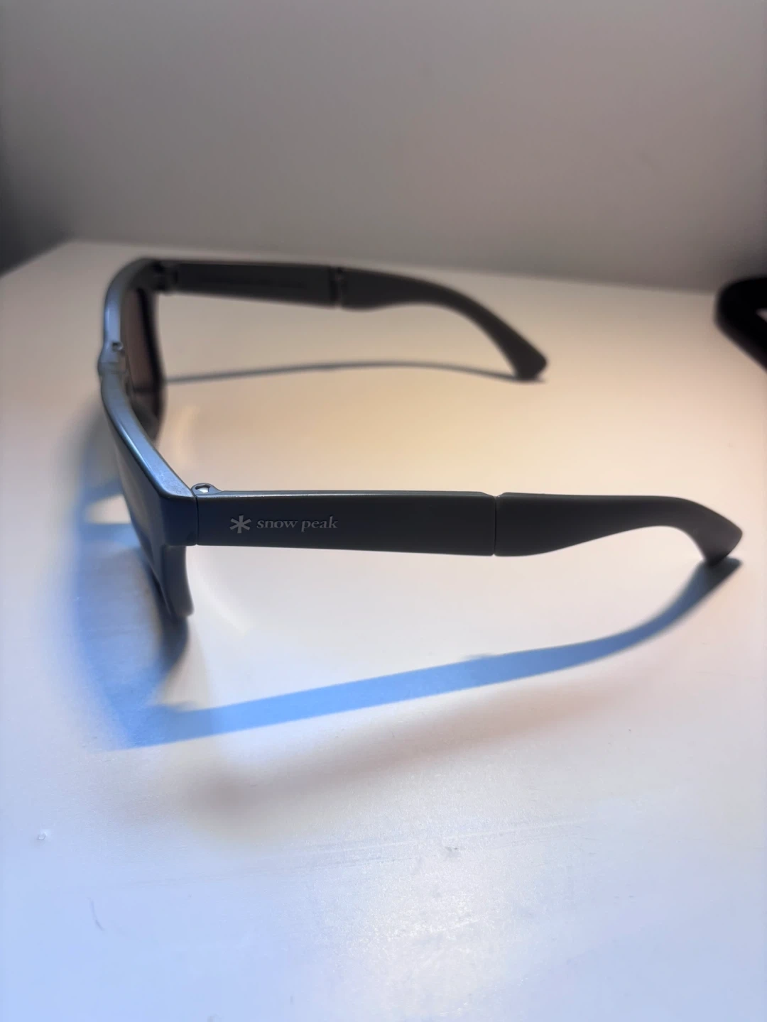 Stylish JINS x Snow Peak sunglasses. These are the URF-215-013AA model. Frame is a cool dark grey with brown lenses. Sizing is 52-21-138. Comes with a Rayban brown case.