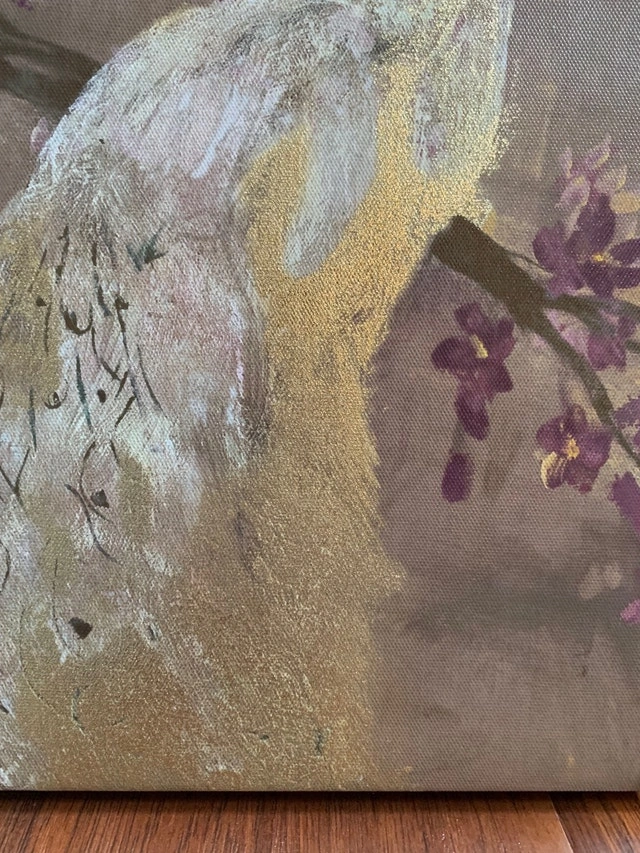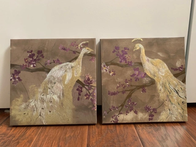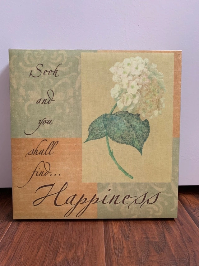 Pretty white flower canvas art, 11 1/2" square - $5.00. Pretty peacock with shiny gold embellishment canvas art (2) - $8.00. 12” square Positive message - “Seek and you shall find happiness” canvas art, 12" square - $5.00. Smoke and pet free home. Keswick Area.
