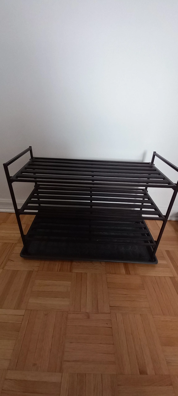 Selling a black metal shoe rack. It has three tiers, providing ample space for your shoes. It's in great condition and ready to organize your entryway or closet