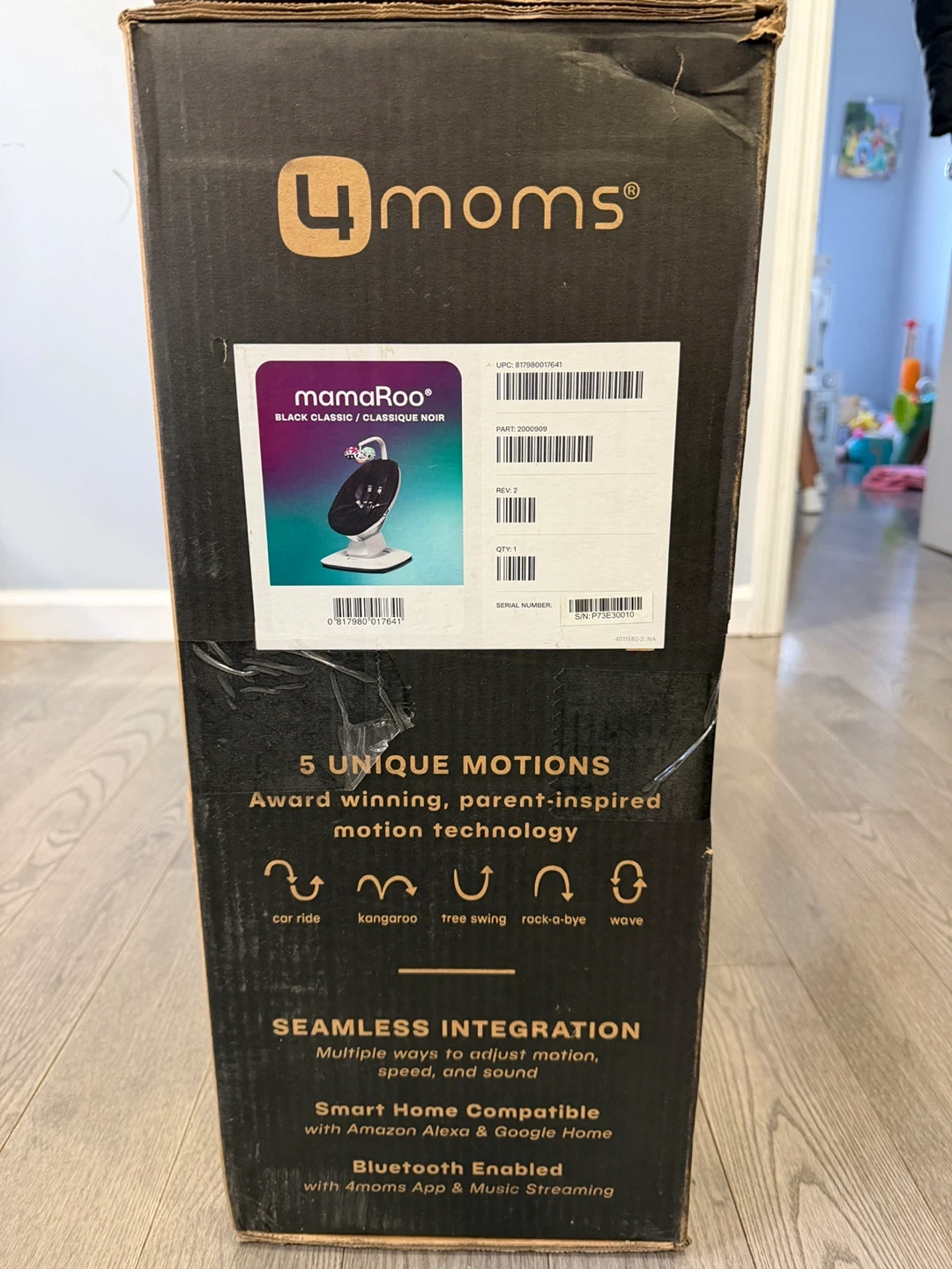 This is the 4moms mamaRoo multi-motion baby swing in Black Classic. It's designed with 5 unique, parent-inspired motions. It's Bluetooth enabled for seamless integration with smart home devices and the 4moms app.