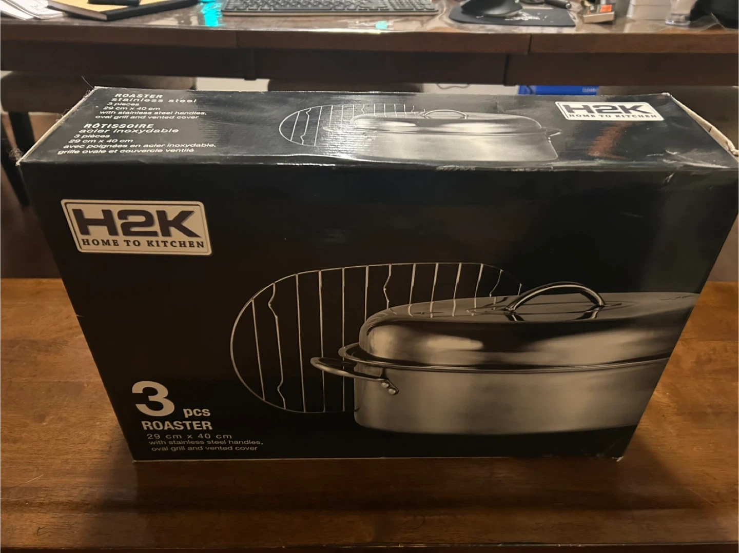 Selling a H2K Home to Kitchen roaster! Used only one time! It's 29cm x 40cm and comes with stainless steel handles, an oval grill, and a vented cover. It's a 3-piece set, ready for your next roast!