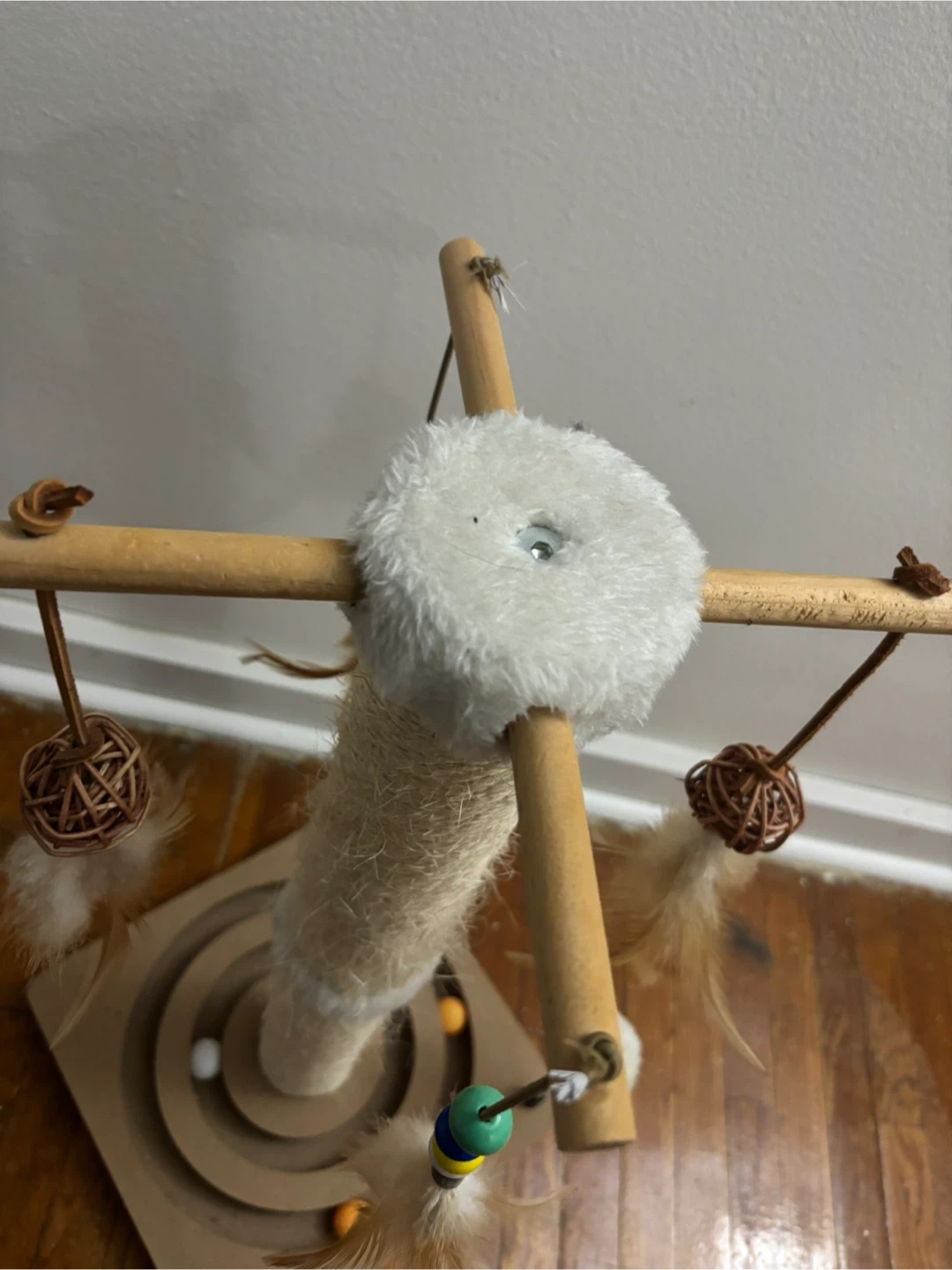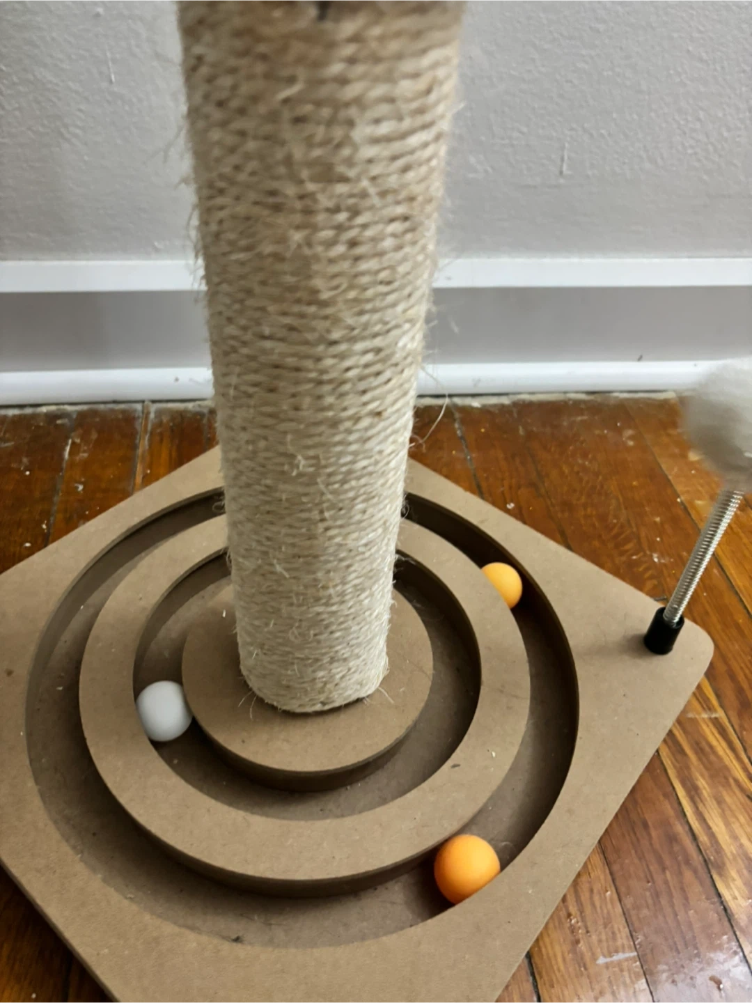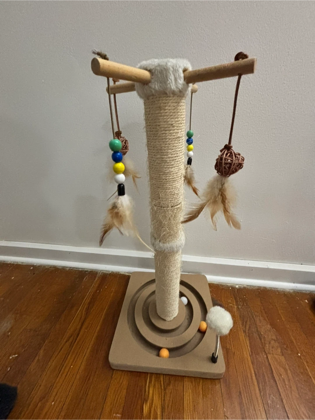 This cat scratching post features a durable sisal rope wrapped column for scratching and a top perch with dangling toys. It also has a fun maze on the base with balls to keep your feline friend entertained. Great for cats to climb, scratch, and play!