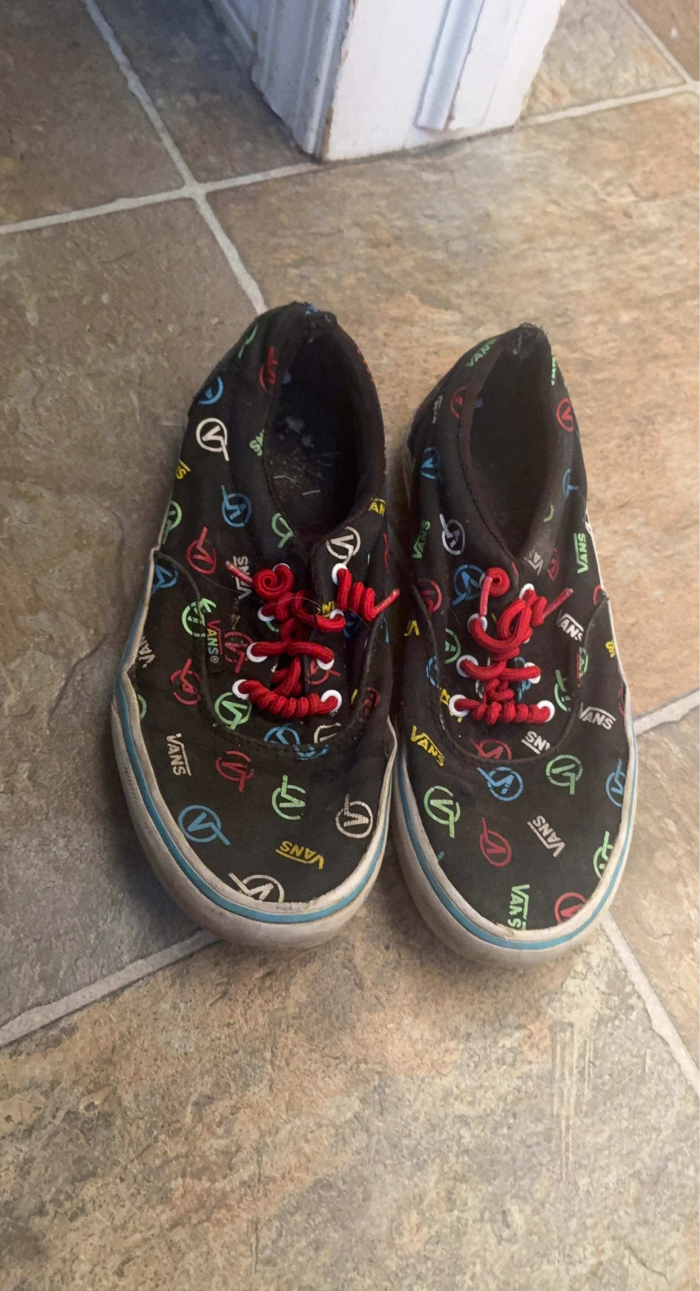These are Vans kids shoes with a black base and colourful Vans logos all over. They have red laces and a blue stripe around the sole. Perfect for everyday wear!