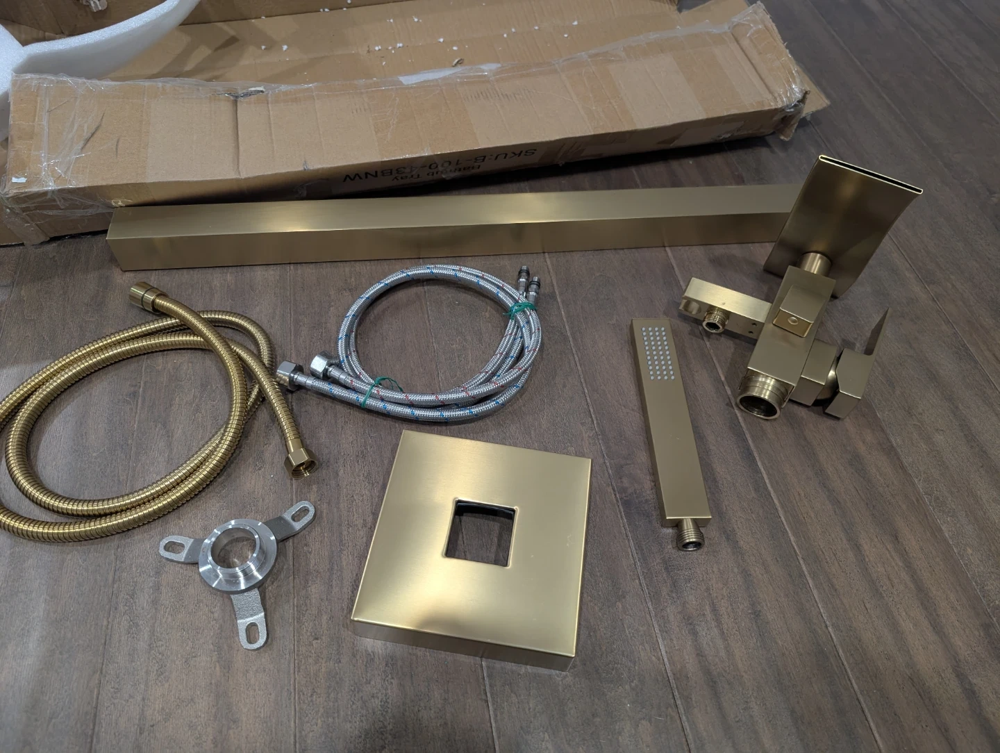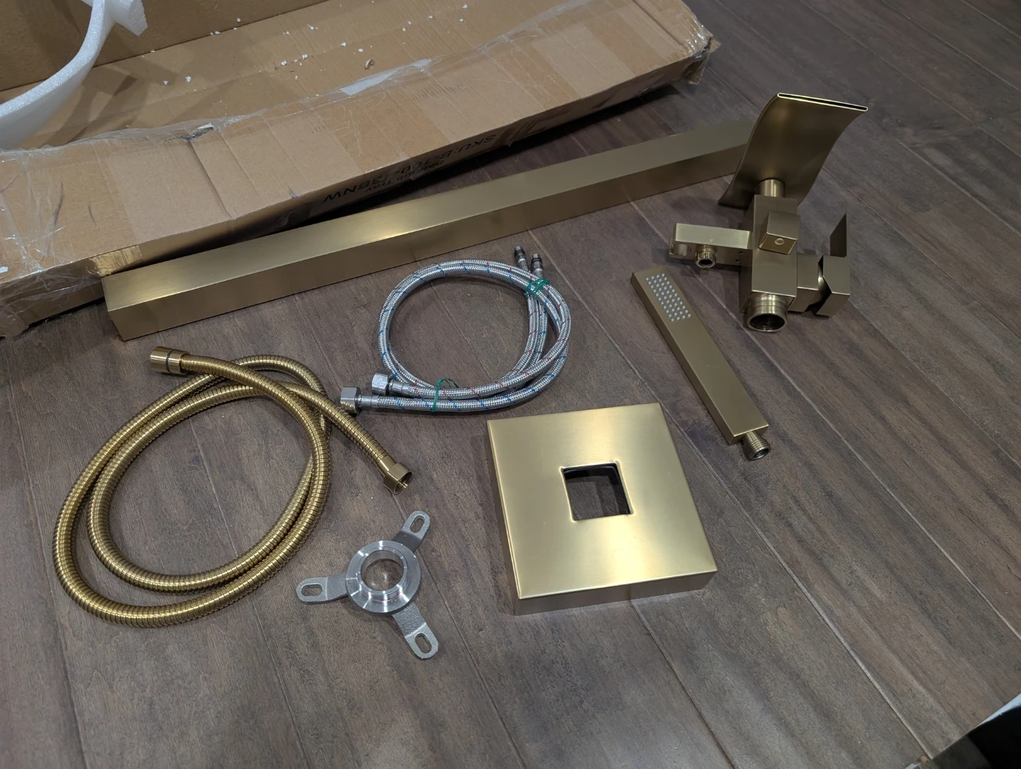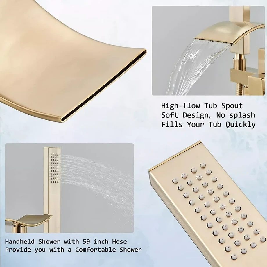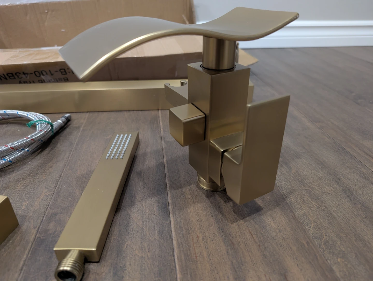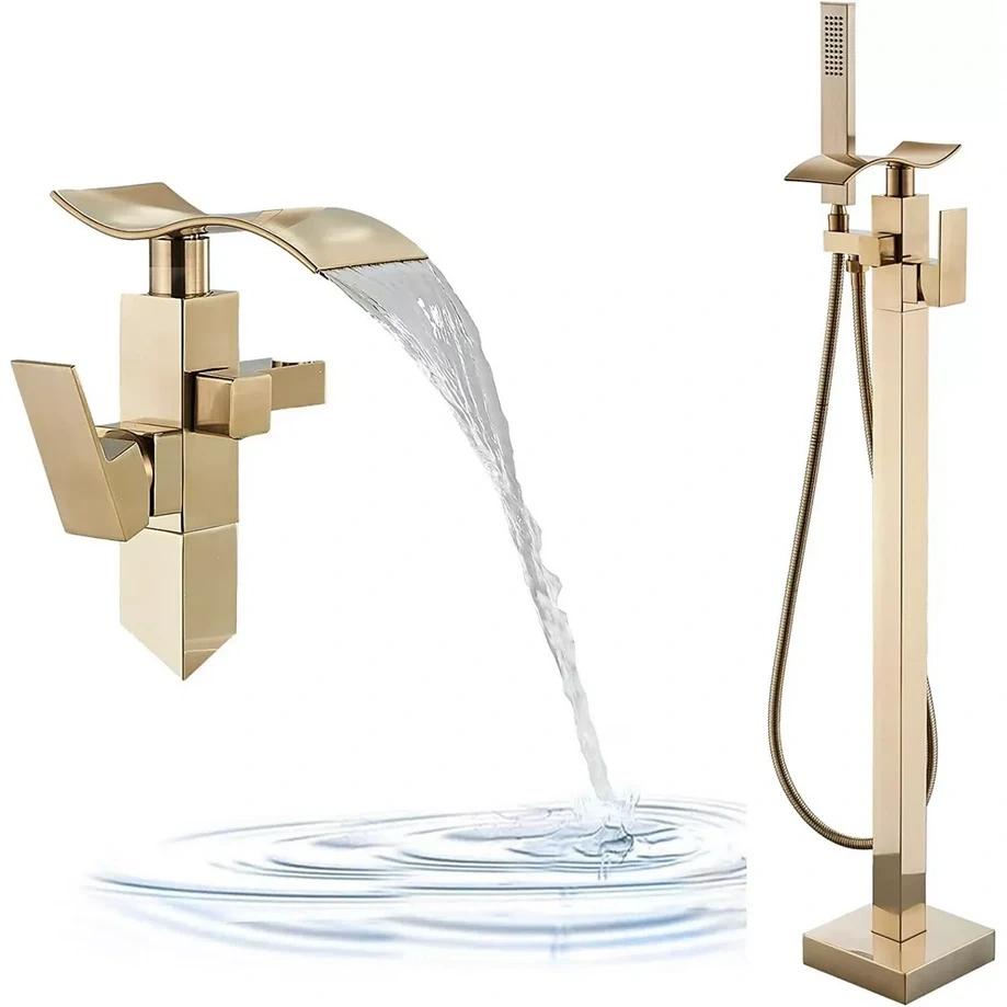 Brand new gold freestanding tub filler waterfall faucet for sale. Stainless steel brass, valve, wand hand shower, mounting hardware, spout swivel, $80 FIRM.